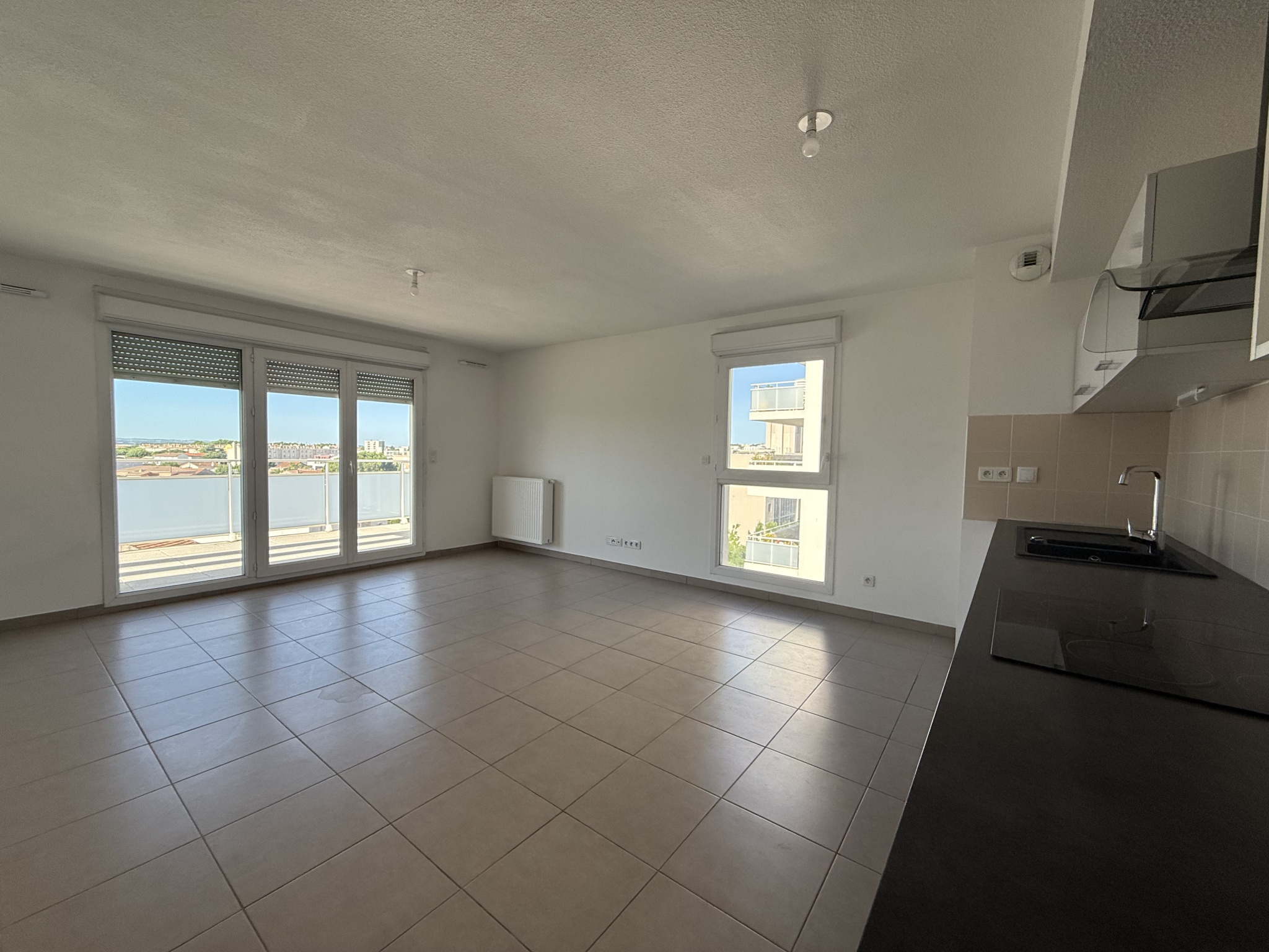 Une cuisine aménagée et semi-équipée, ouverte sur un séjour lumineux donnant sur la terrasse.