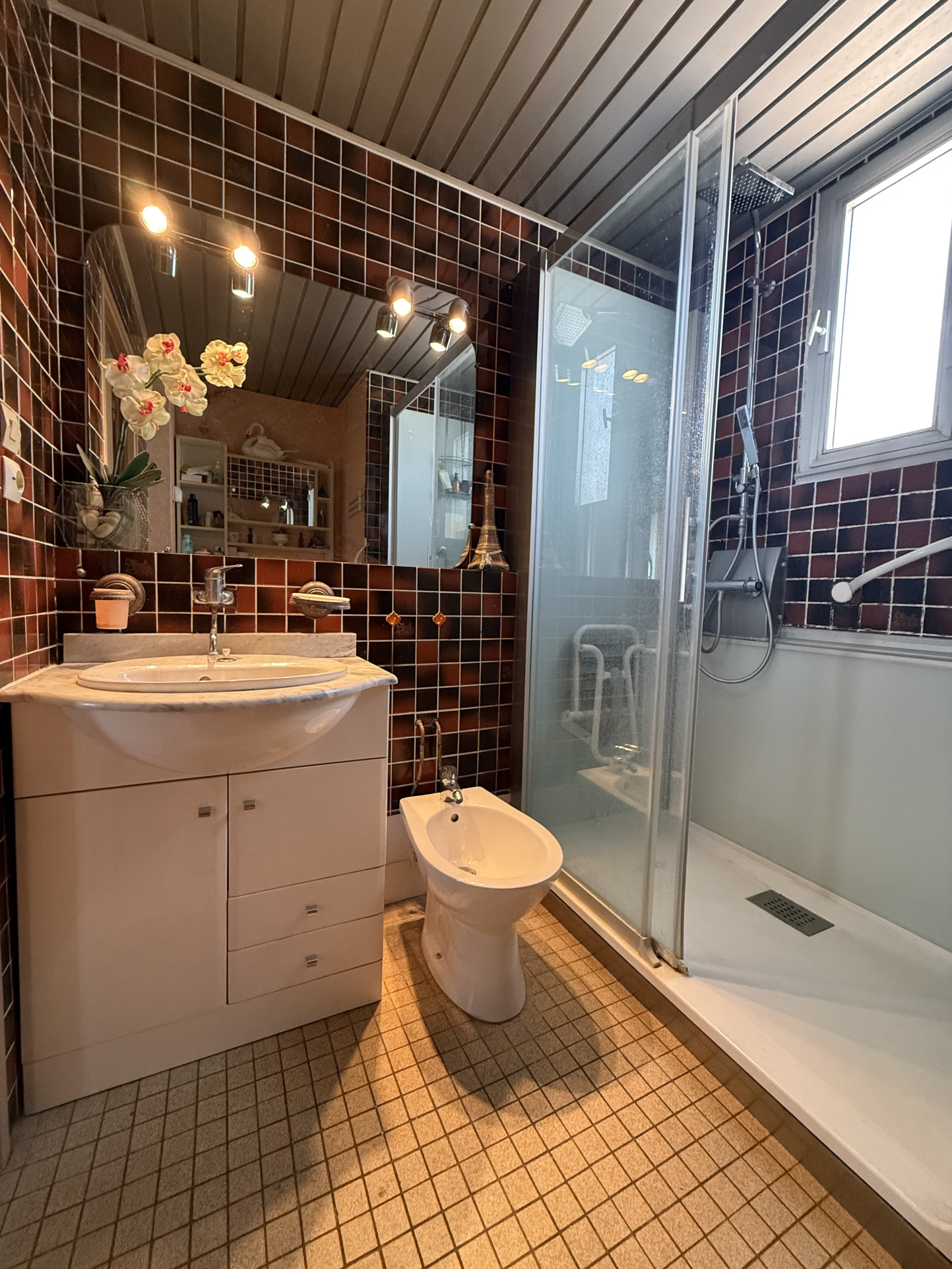 À l’extérieur, il est possible de stationner un véhicule sur la parcelle. Vous profiterez également d’un bassin à poissons, d’une terrasse avec barbecue intégré sous poutres, d’un garage à porte manuelle et d’un espace extérieur dallé.