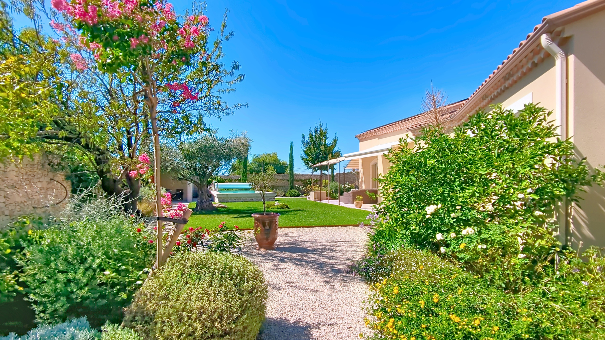 Un jardin paysager soigneusement entretenu avec sa piscine rafraîchissante et son pool house, véritable invitation à la détente et aux loisirs en extérieur.
