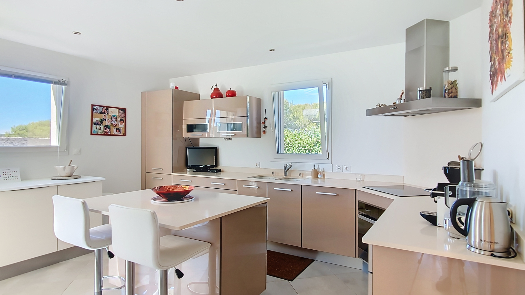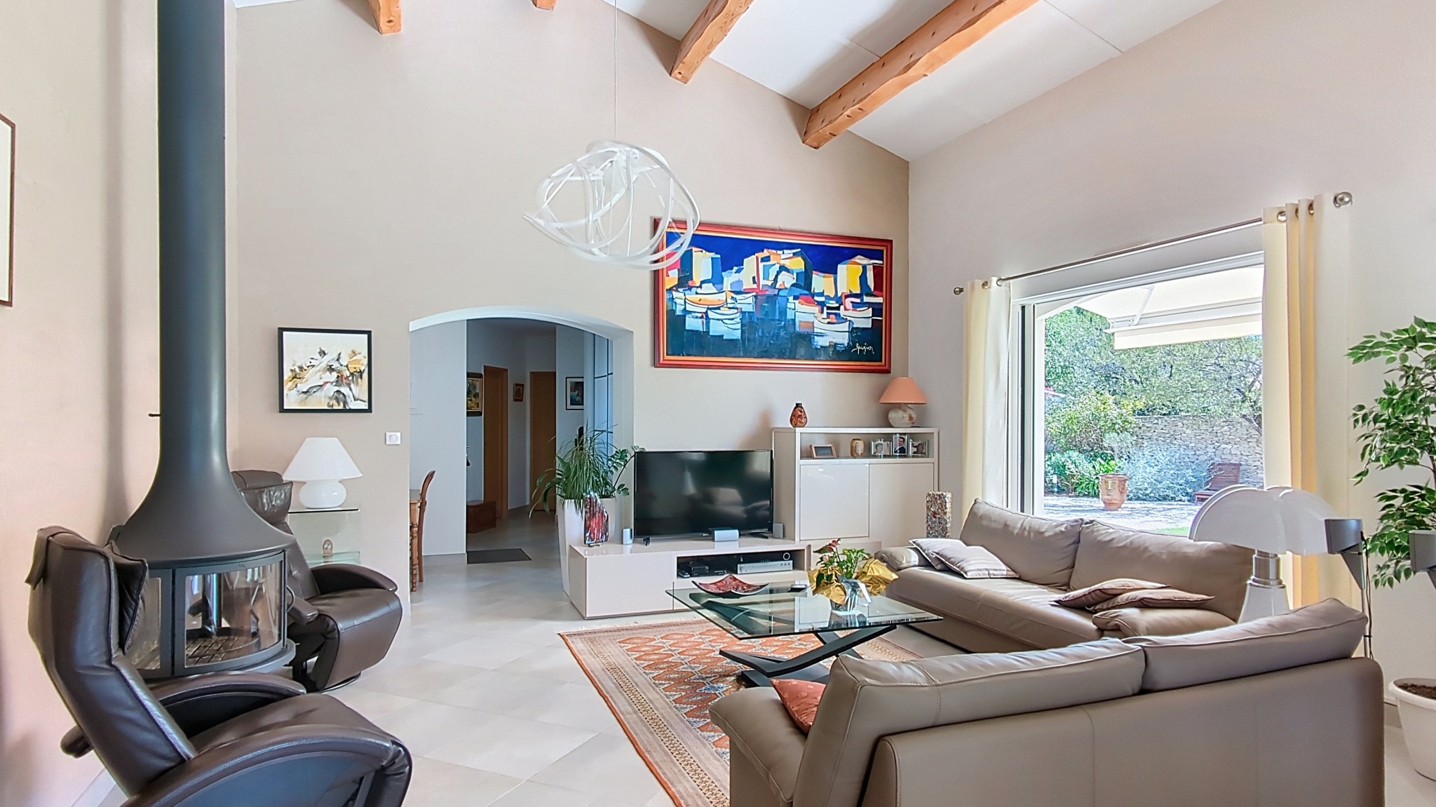 La maison se compose: d’un vaste et lumineux séjour-salle à manger agrémenté d’un impressionnant plafond cathédrale, créant un volume et une atmosphère unique , d’une cuisine entièrement équipée donnant accès sur une terrasse.
