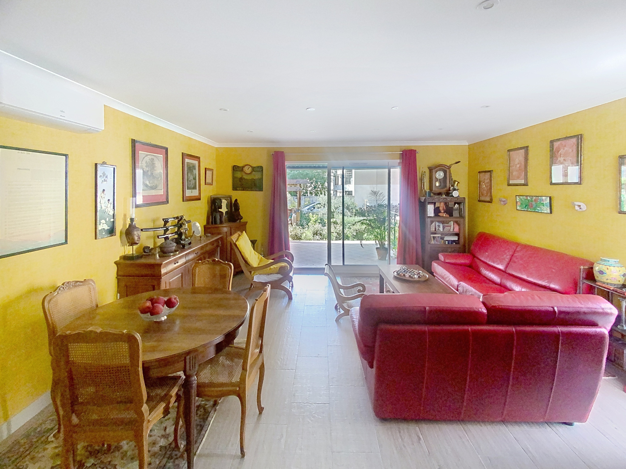 Grande pièce de vie baignée de lumière, ouverte sur une cuisine moderne et équipée