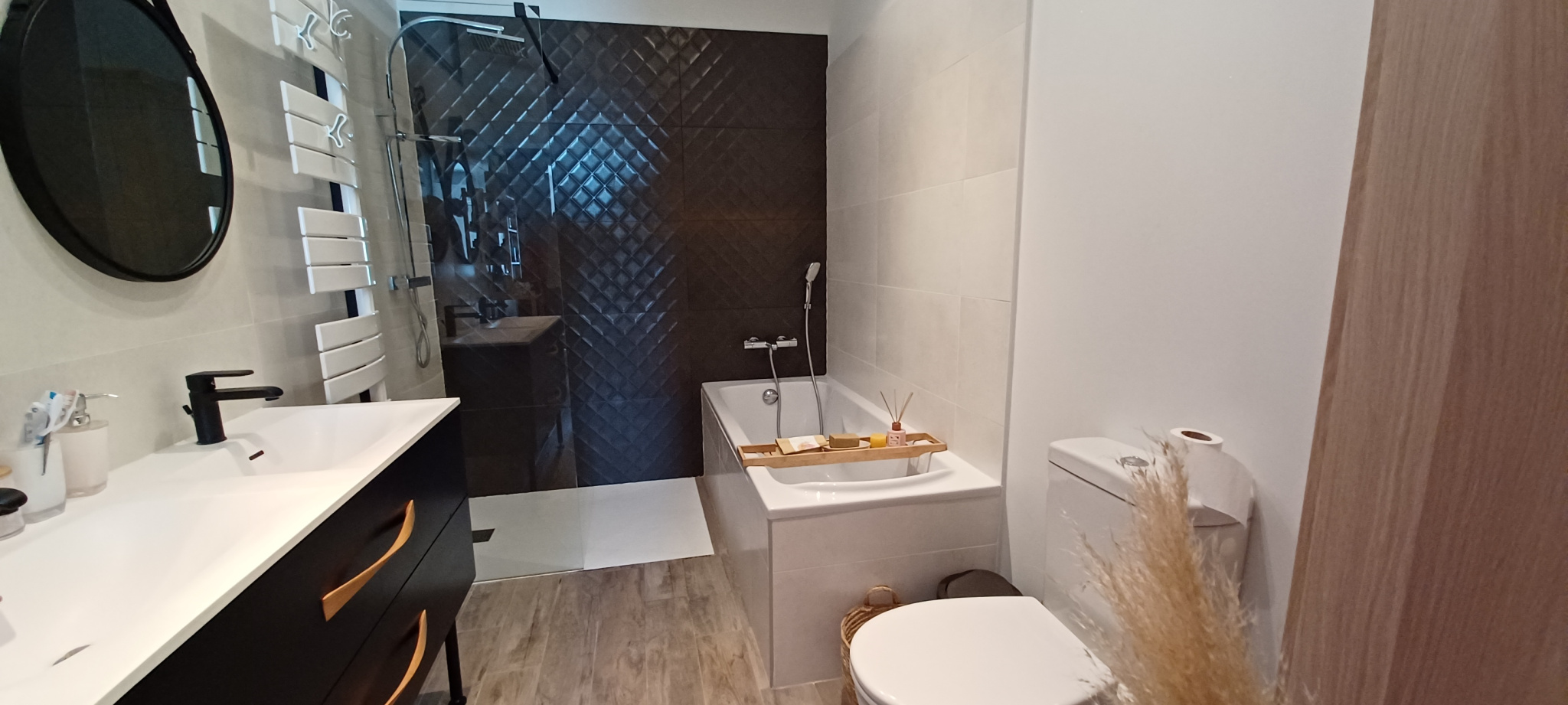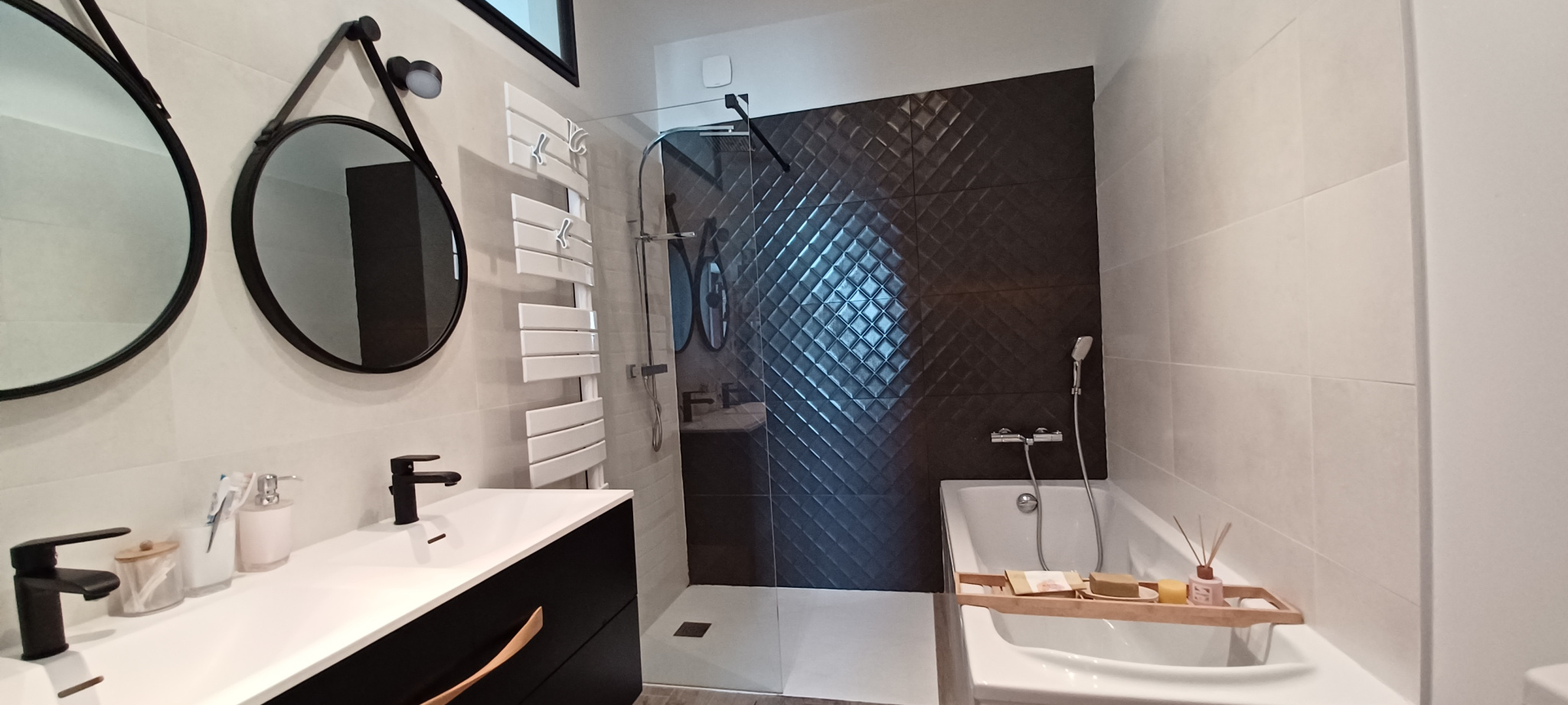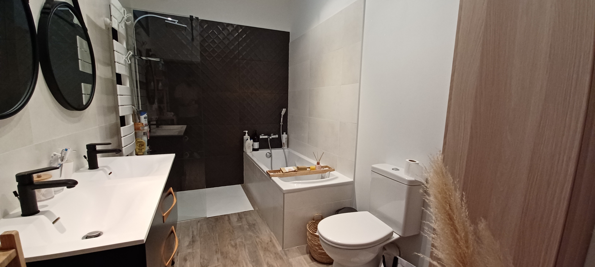 À l’étage de chambre de 12m2 avec rangement, la salle de bain avec douche, WC et double vasque, toujours très bien rénové et plein de charme.