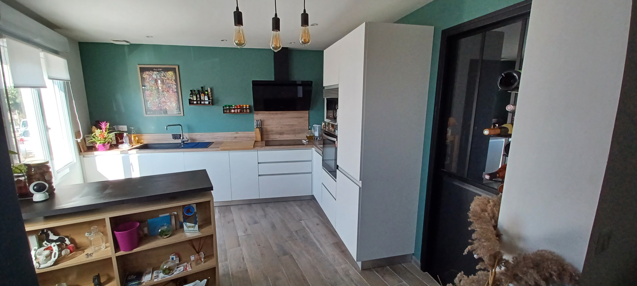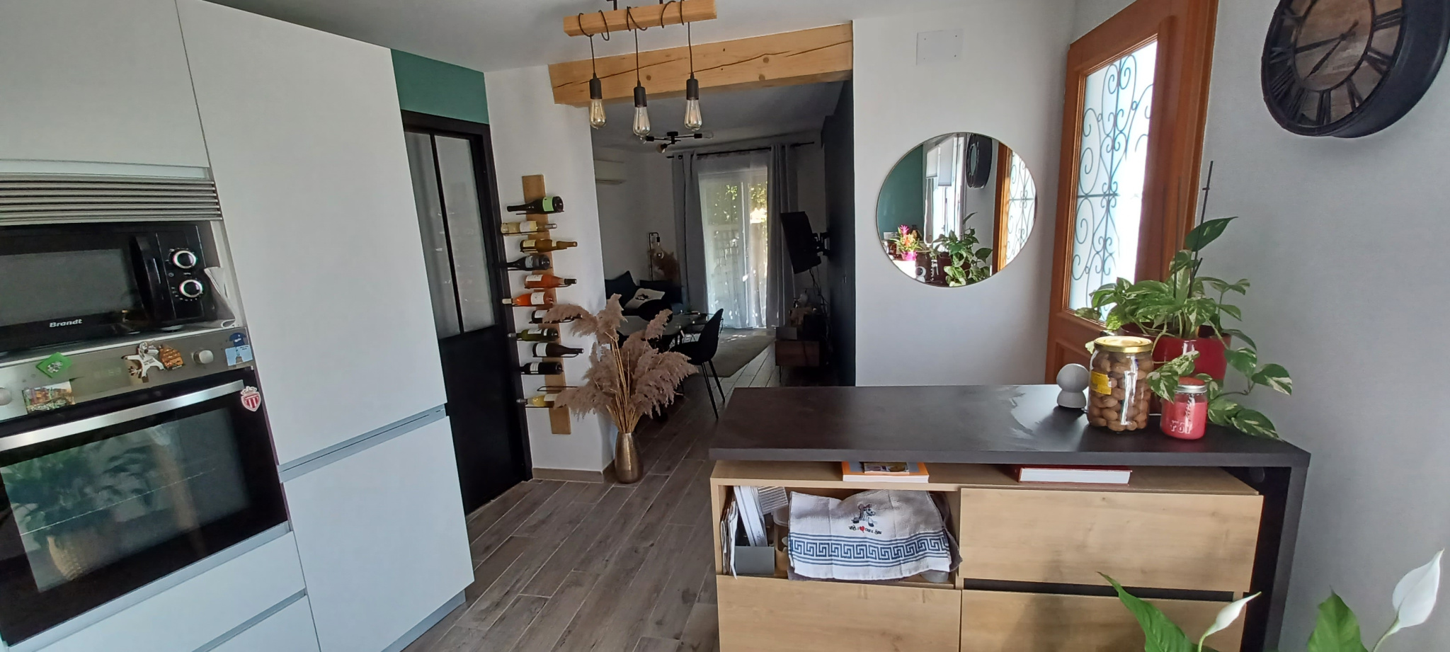 Cette maison en R+1 se compose à l’entrée d’une cuisine toute équipée et moderne, un cellier qui renferme un WC, le salon avec un rangement et l’accès à la terrasse.