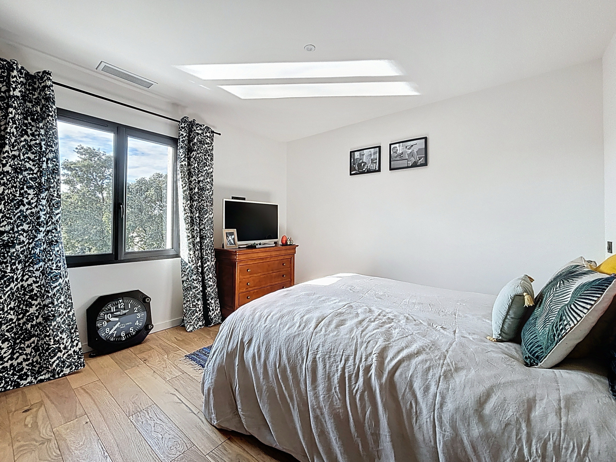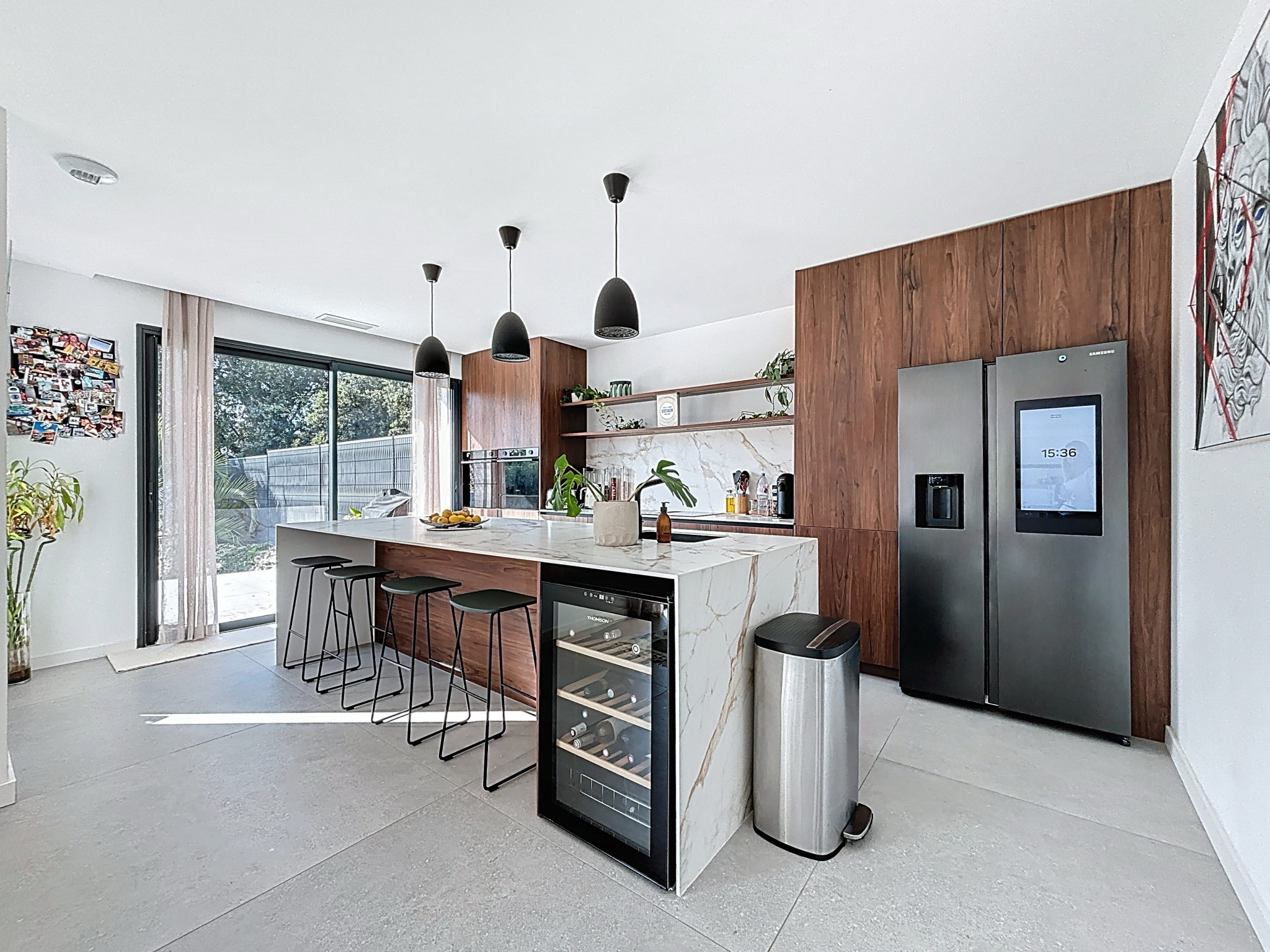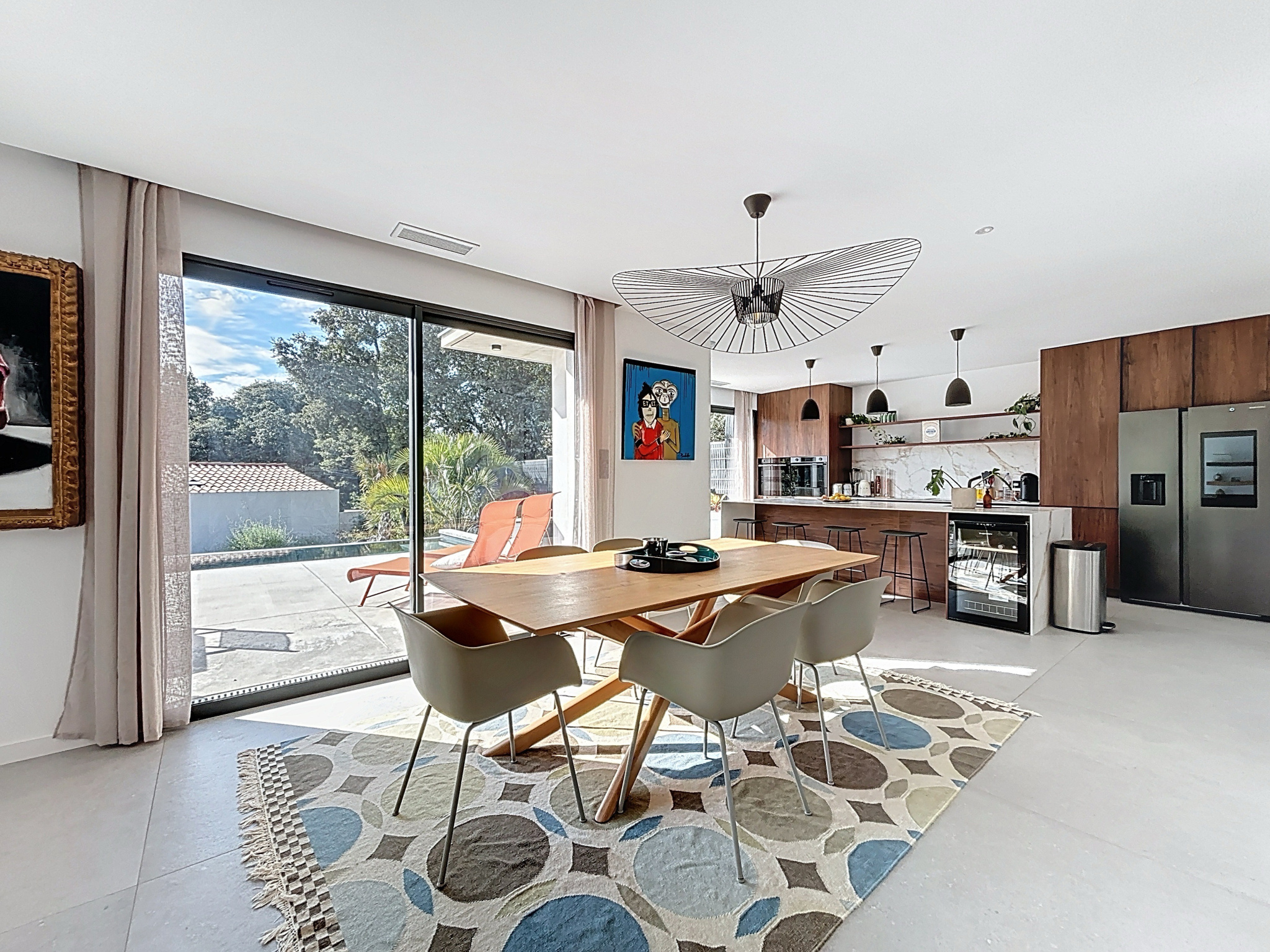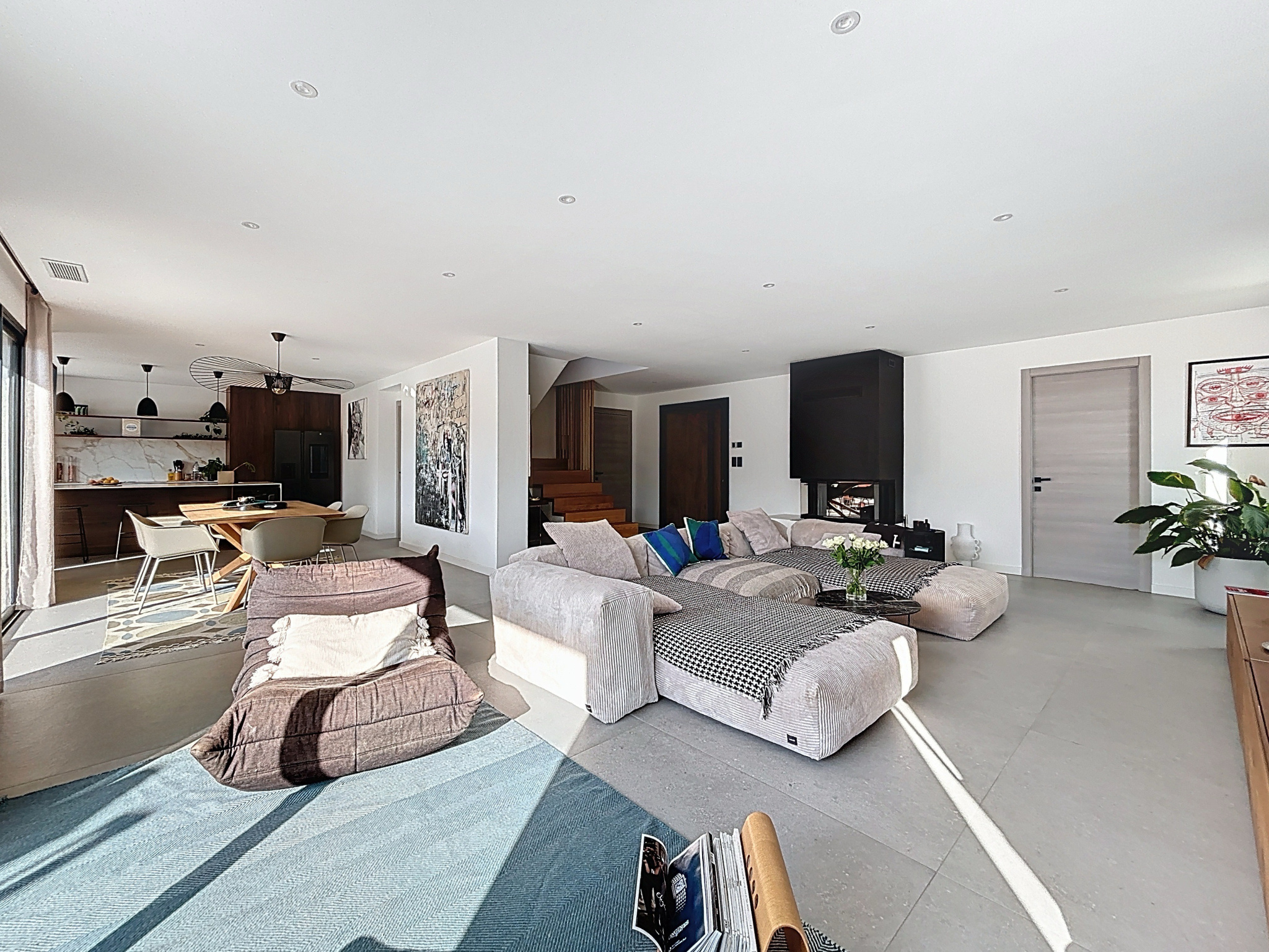 Édifiée sur un terrain sans vis-à-vis, elle offre 183 m2 habitables conçus pour un confort absolu. Au rez-de-chaussée, un vaste espace de vie de 82 m2 baignée de lumière s’ouvre sur une piscine à débordement et une terrasse offrant une vue dégagée sur le jardin. La suite parentale dispose d’un dressing et d’une salle d’eau privative. Une buanderie, un wc indépendant et un garage complètent ce niveau.