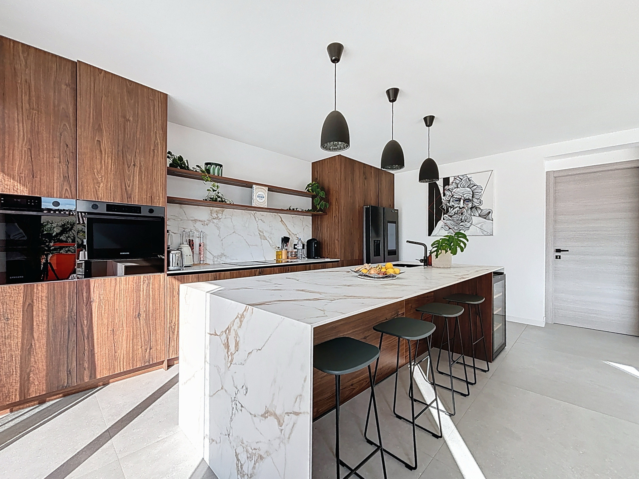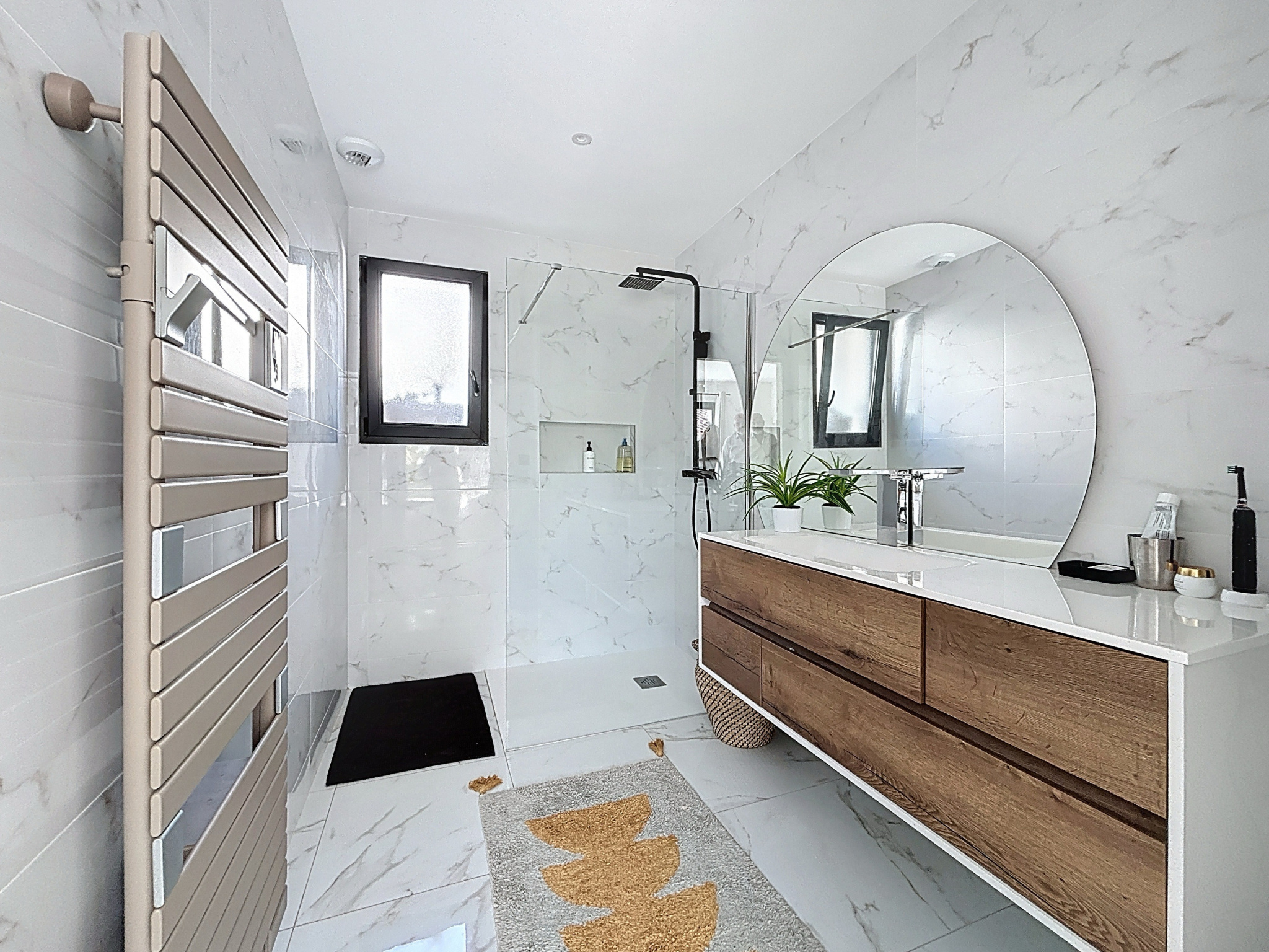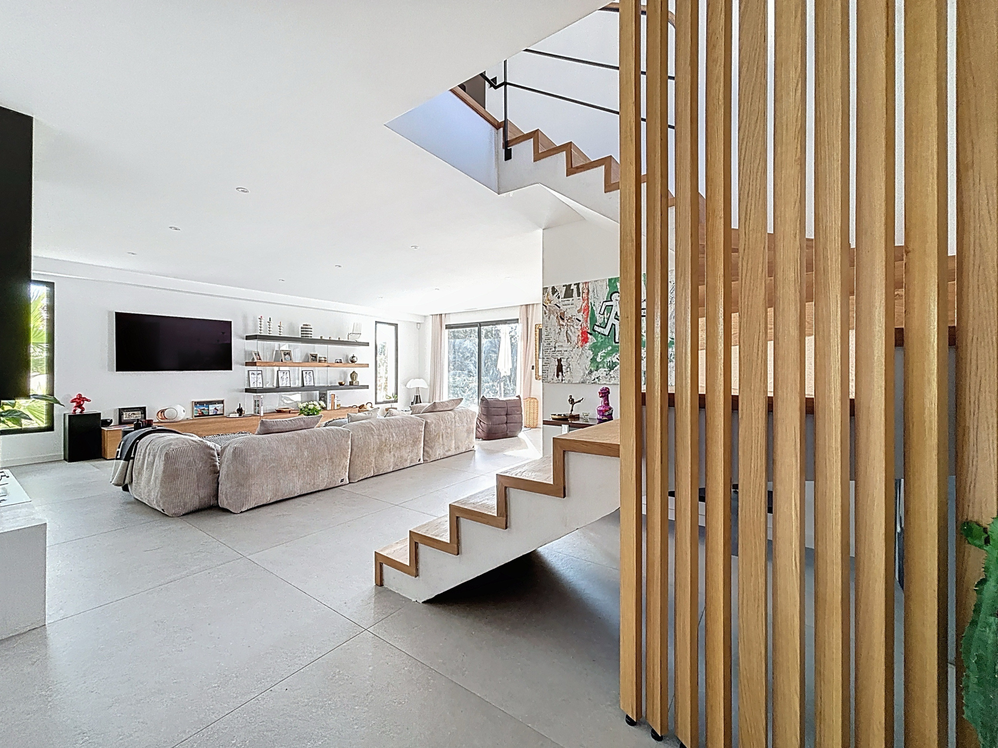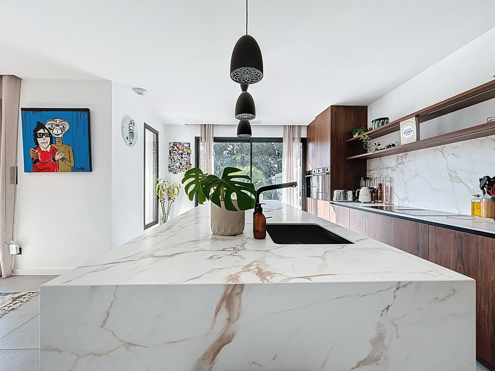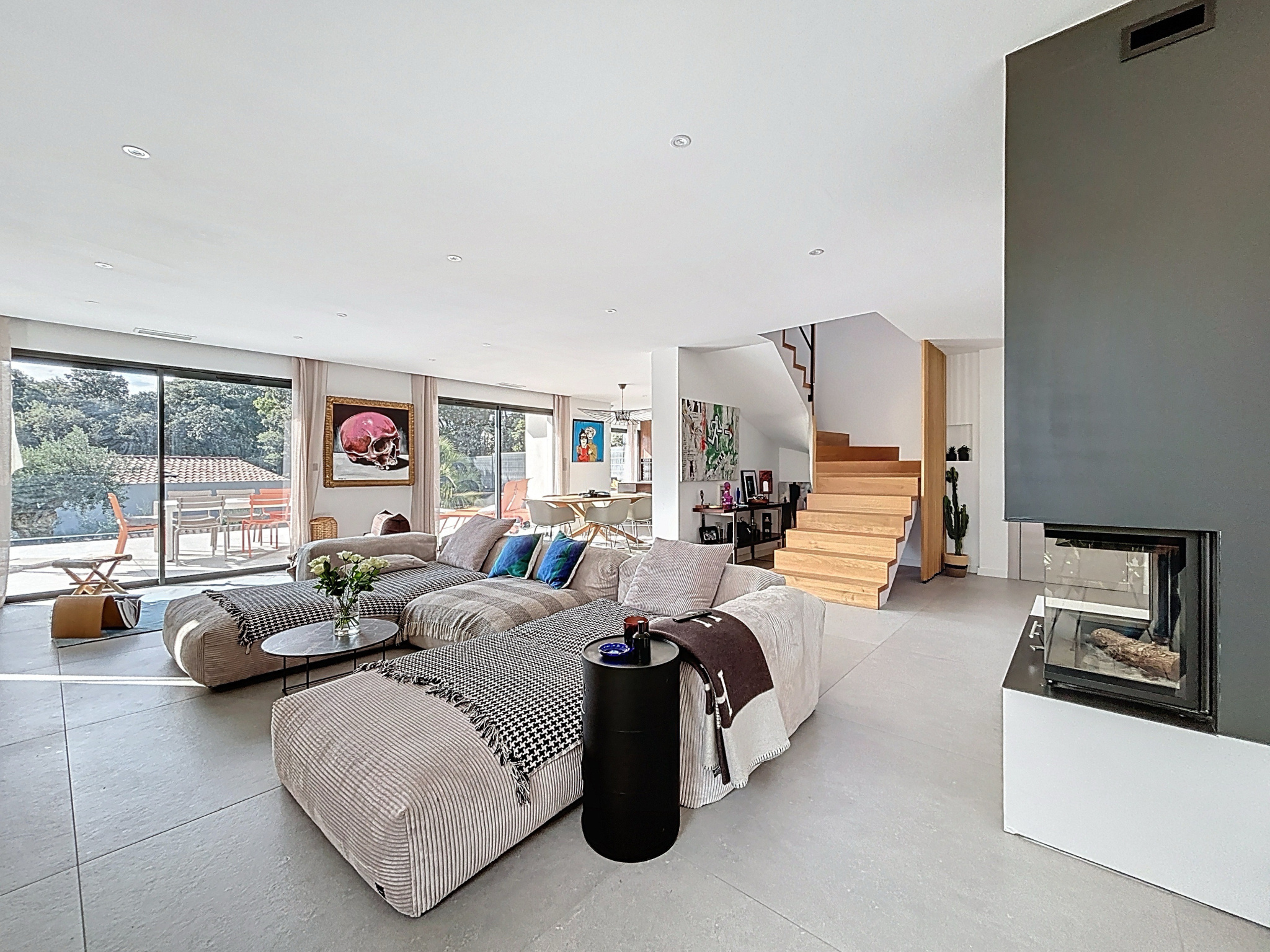 Édifiée sur un terrain sans vis-à-vis, elle offre 183 m2 habitables conçus pour un confort absolu. Au rez-de-chaussée, un vaste espace de vie de 82 m2 baignée de lumière s’ouvre sur une piscine à débordement et une terrasse offrant une vue dégagée sur le jardin. La suite parentale dispose d’un dressing et d’une salle d’eau privative. Une buanderie, un wc indépendant et un garage complètent ce niveau.