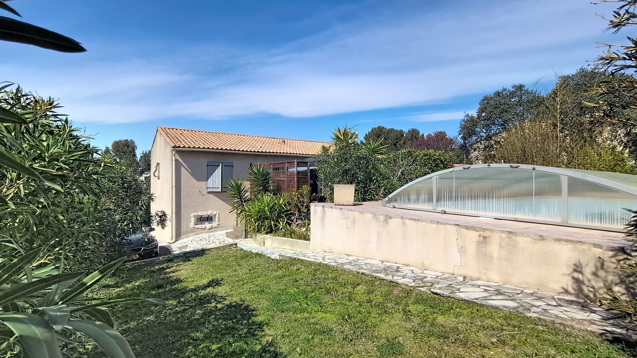 Implantée sur une parcelle d’environ 800 m2, la maison bénéficie d’aménagements extérieurs soignés :