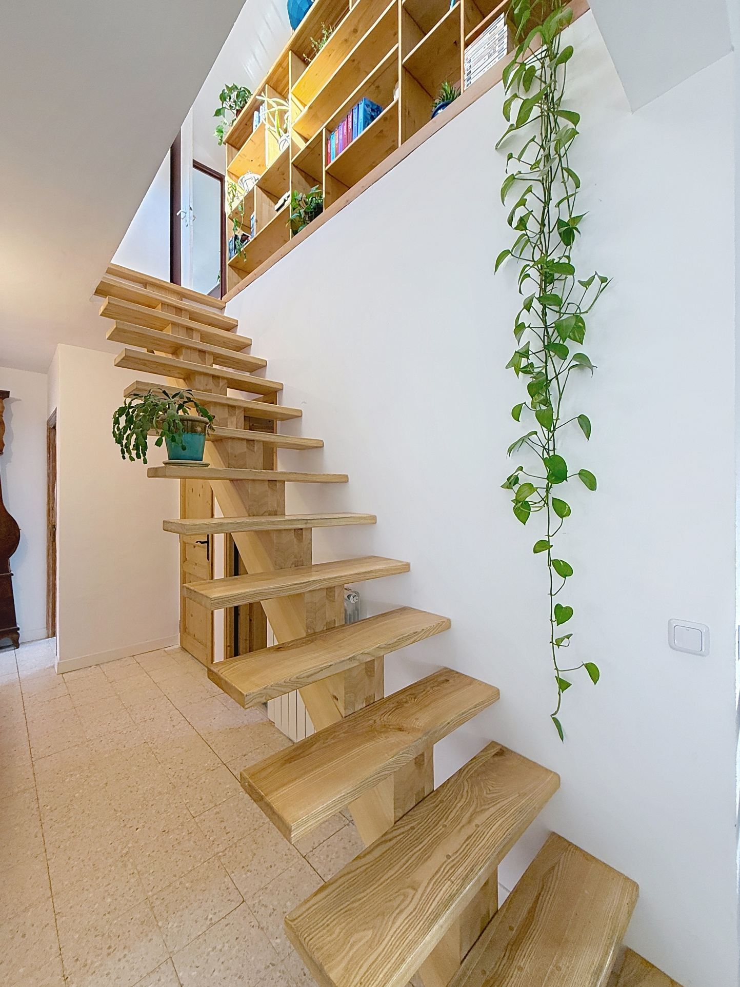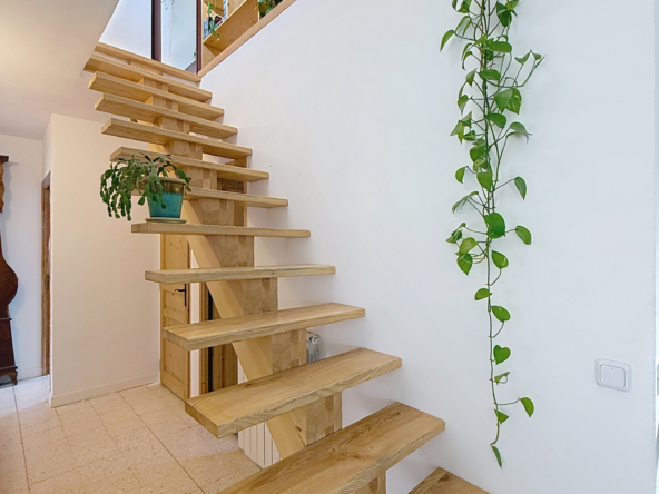À l’étage : Un magnifique escalier en bois mène à un espace bureau ainsi qu’à deux chambres mansardées, parfaites pour un coin nuit chaleureux et intimiste.
