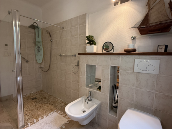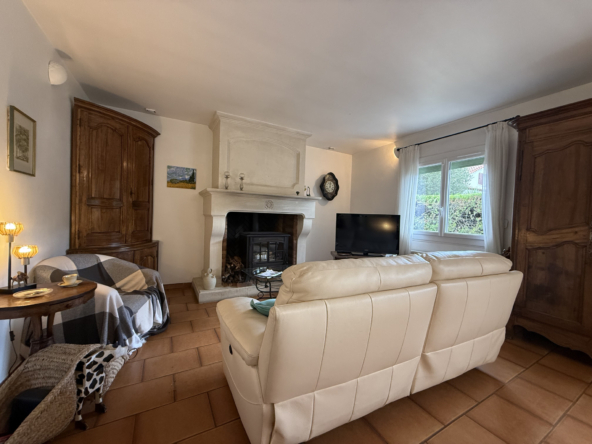 Le bien se compose d’une entrée, d’une cuisine fermée et entièrement équipée, d’une buanderie/cellier, ainsi que d’un salon/salle à manger agrémenté d’une grande cheminée avec poêle. Il offre également trois chambres, une salle d’eau avec WC, bidet et une spacieuse douche à l’italienne.