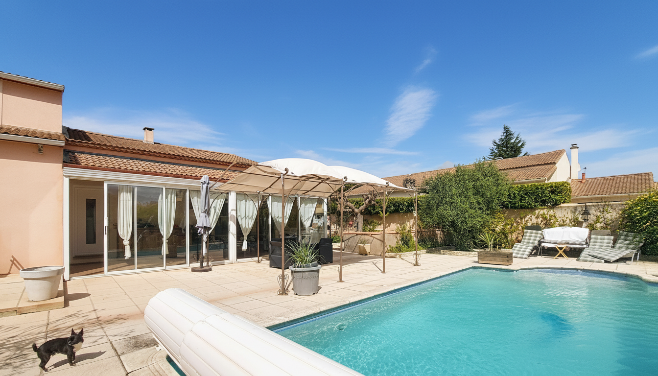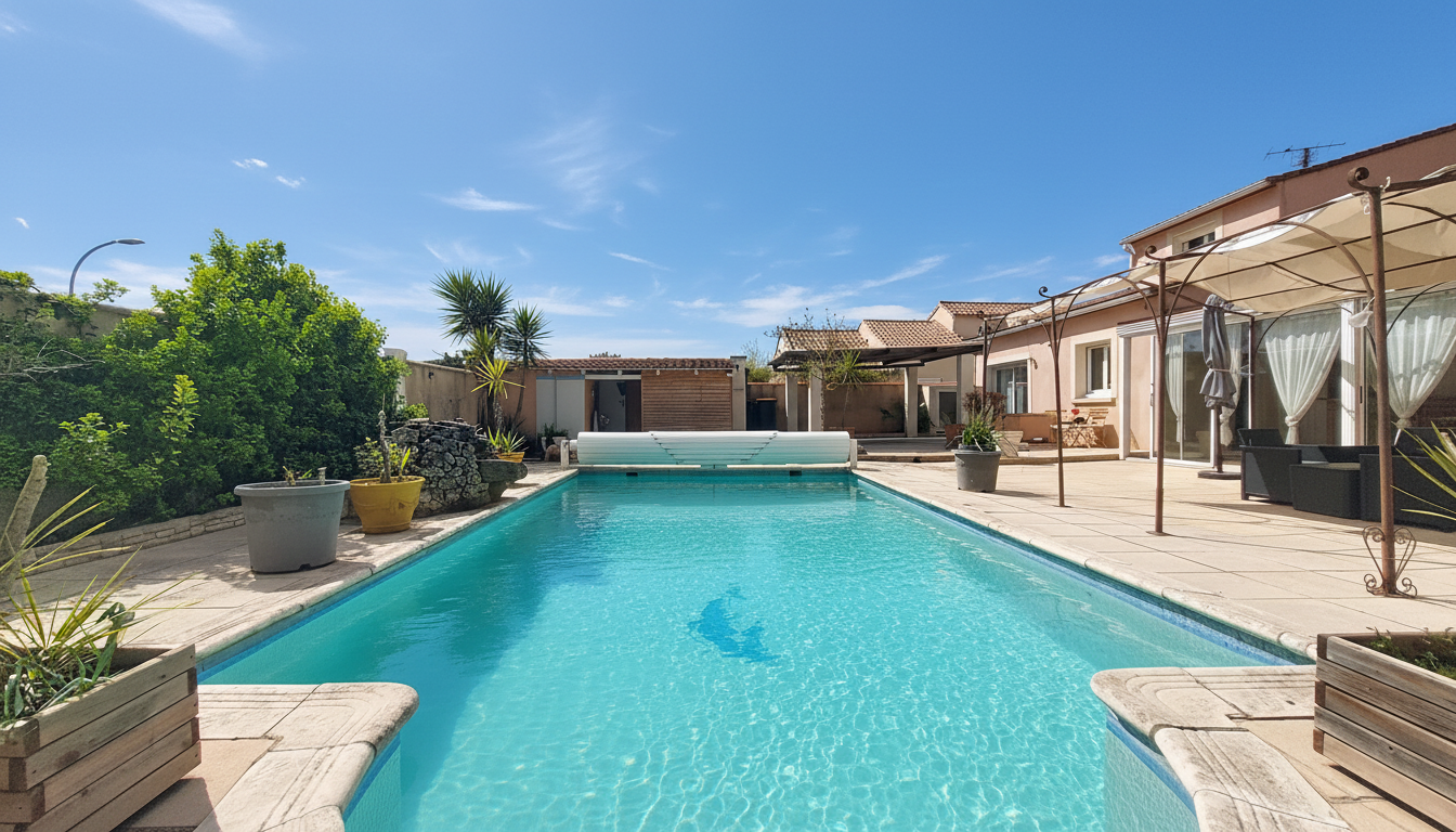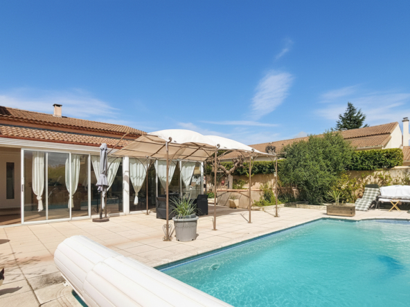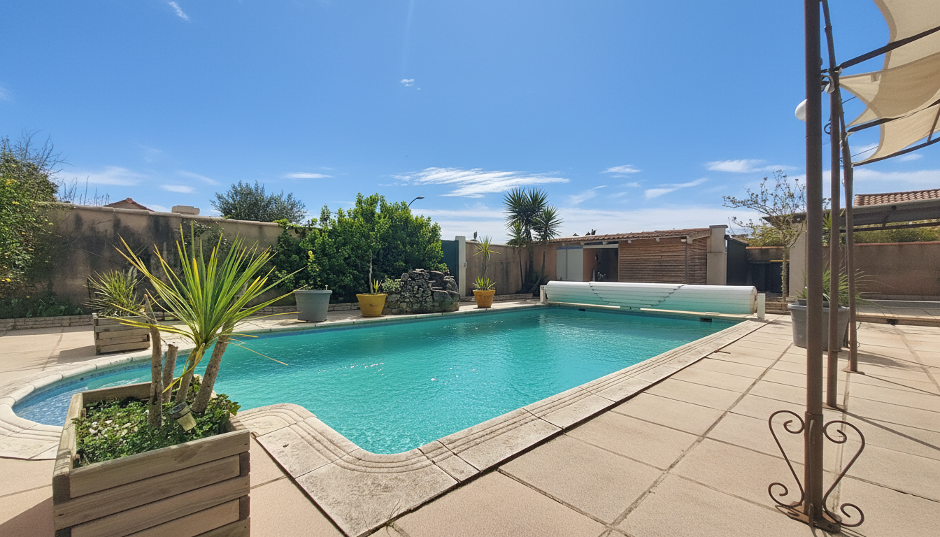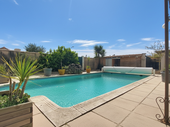 La parcelle d’environ 600m2 vous accueille avec une grande terrasse et pergola , une piscine et son volet roulant, un carport pour la voiture avec portail motorisé,un abris, le tout paysagé avec un entretien restreint pour profiter en famille et avec des amis.