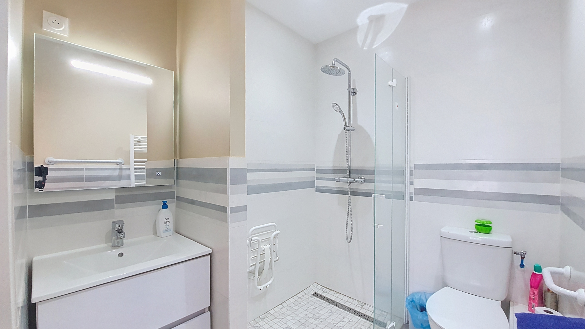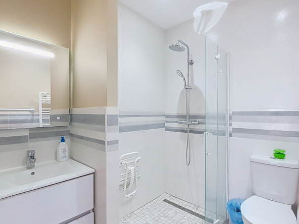 Une salle de bain de 9m2 équipée d’une douche, d’une baignoire, et de deux vasques.