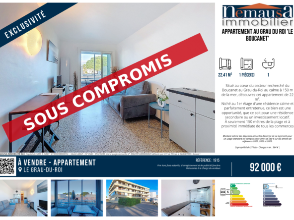Situé au cœur du secteur recherché du Boucanet au Grau-du-Roi au calme à 150 m de la mer, découvrez cet appartement de 22 m2.