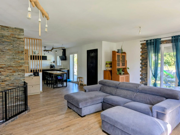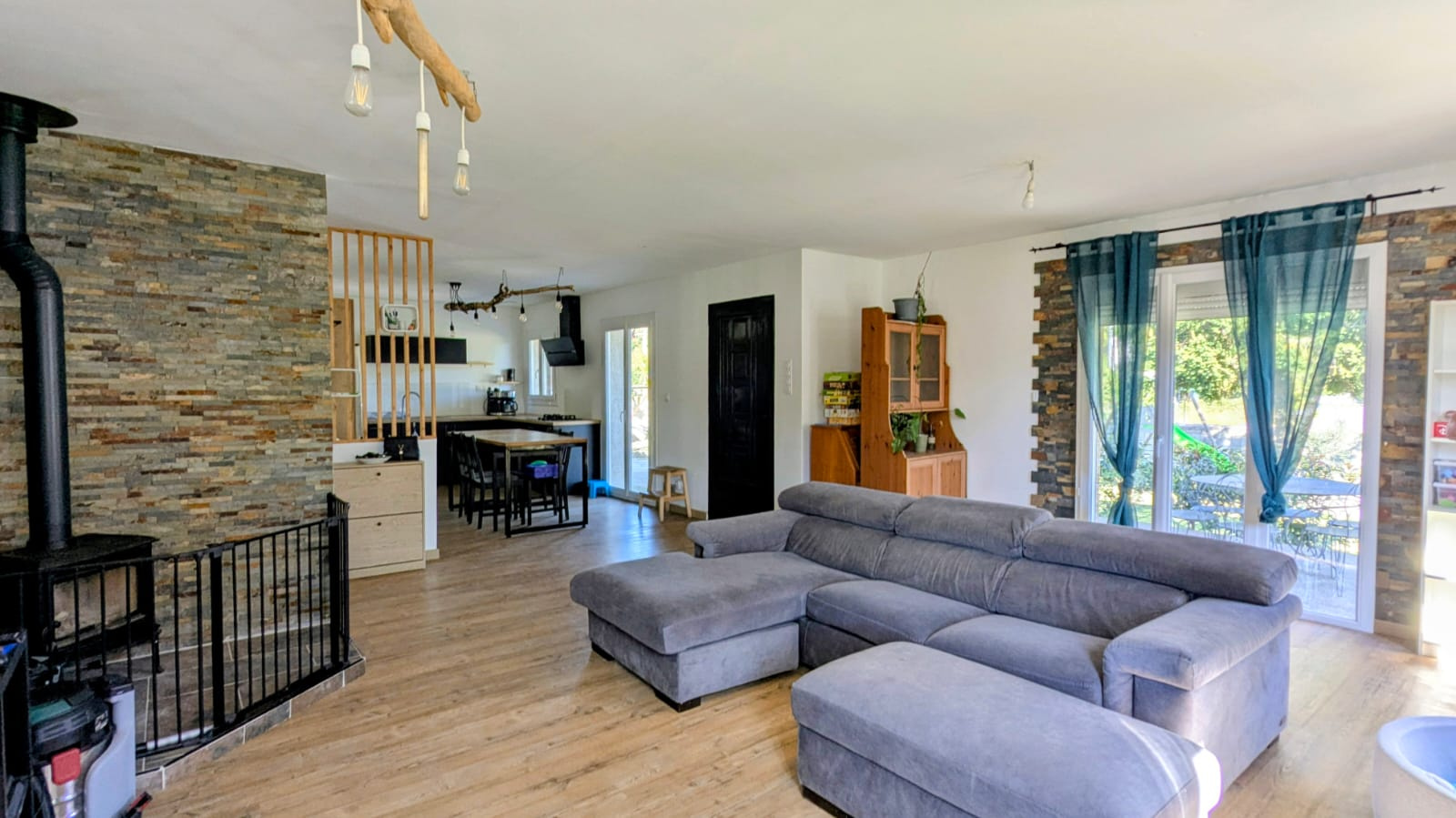 L’entrée s’ouvre sur une spectaculaire pièce de vie lumineuse de plus de 50 m2, véritable atout de cette maison. Elle accueille une cuisine ouverte moderne, entièrement équipée, parfaite pour recevoir. Le confort thermique est assuré par un chaleureux poêle à bois en complément du chauffage central au gaz (cuve).