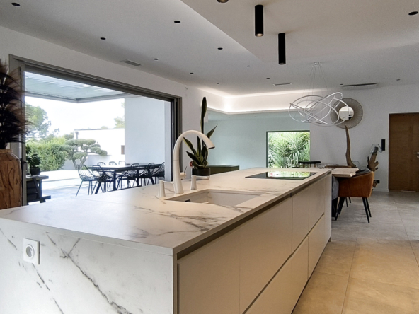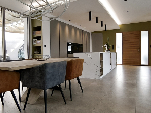 Construite en 2020, cette villa spacieuse s’étend sur une superficie habitable de 163 m2. Dès votre entrée, vous serez séduit par un vaste séjour salle à manger de 68 m2, baigné de lumière naturelle, agrémenté d’une cuisine entièrement équipée. La grande baie vitrée à galandage vous permettent de profiter à un accès direct à une magnifique terrasse. La villa principale, d’une superficie de 163 m2, comprend un espace de vie comprenant le séjour/cuisine, véritable cœur de la maison. Vous y trouverez également une suite parentale de 30 m2 avec un dressing fonctionnel et une salle de bains avec douche italienne ainsi qu’un WC séparé. De plus, trois chambres supplémentaires, correspondent respectivement à11 m2, ainsi qu’une seconde salle d’eau coté enfant et son WC indépendant, vous offriront un espace confortable et accueillant pour toute la famille.