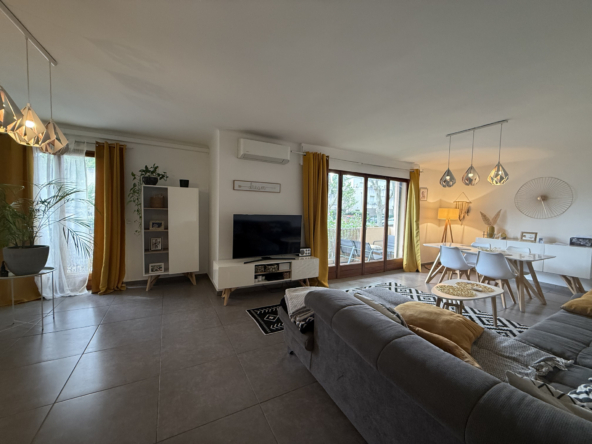 Il se compose d’une entrée, d’une cuisine aménagée et semi-équipée (hotte, plaque au gaz et évier) donnant sur un cellier, ainsi que d’un vaste salon/séjour de 37 m2 équipé d’une climatisation réversible et ouvrant sur un balcon de 5 m2. Le couloir, doté de grands placards, mène à trois chambres dont une avec placard intégré et climatisation réversible. L’appartement dispose également d’un dressing, d’une salle de bains avec fenêtre et d’un WC séparé, également avec fenêtre.