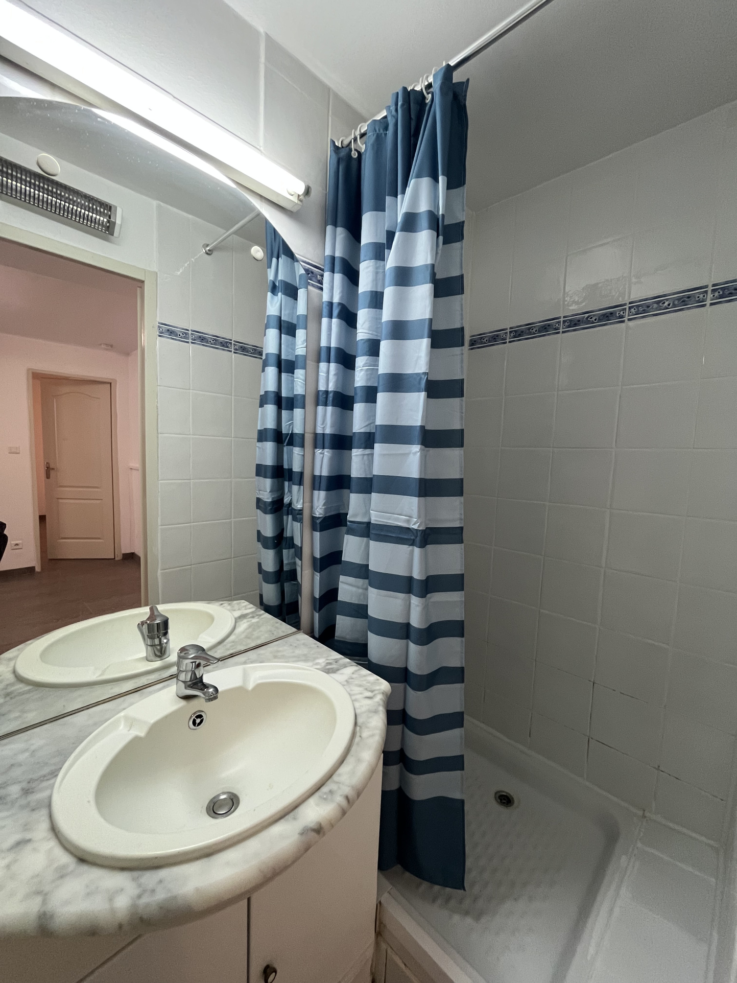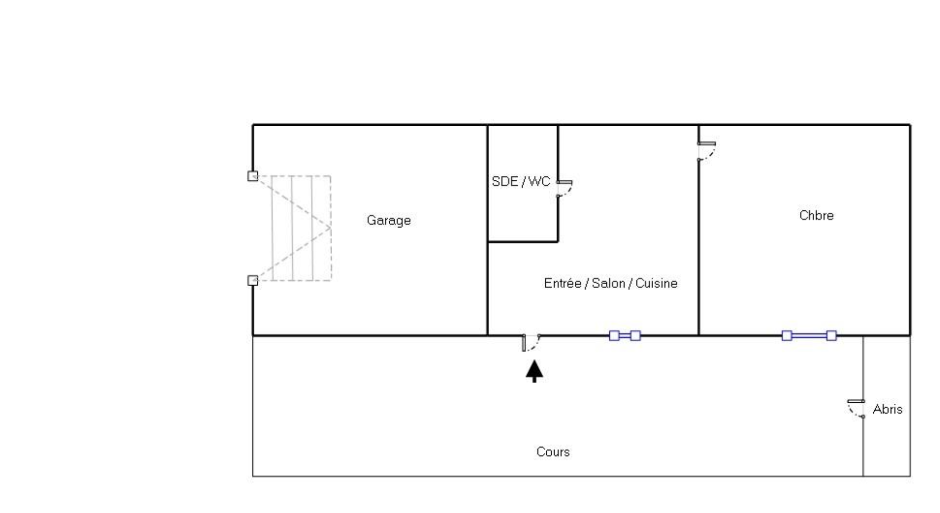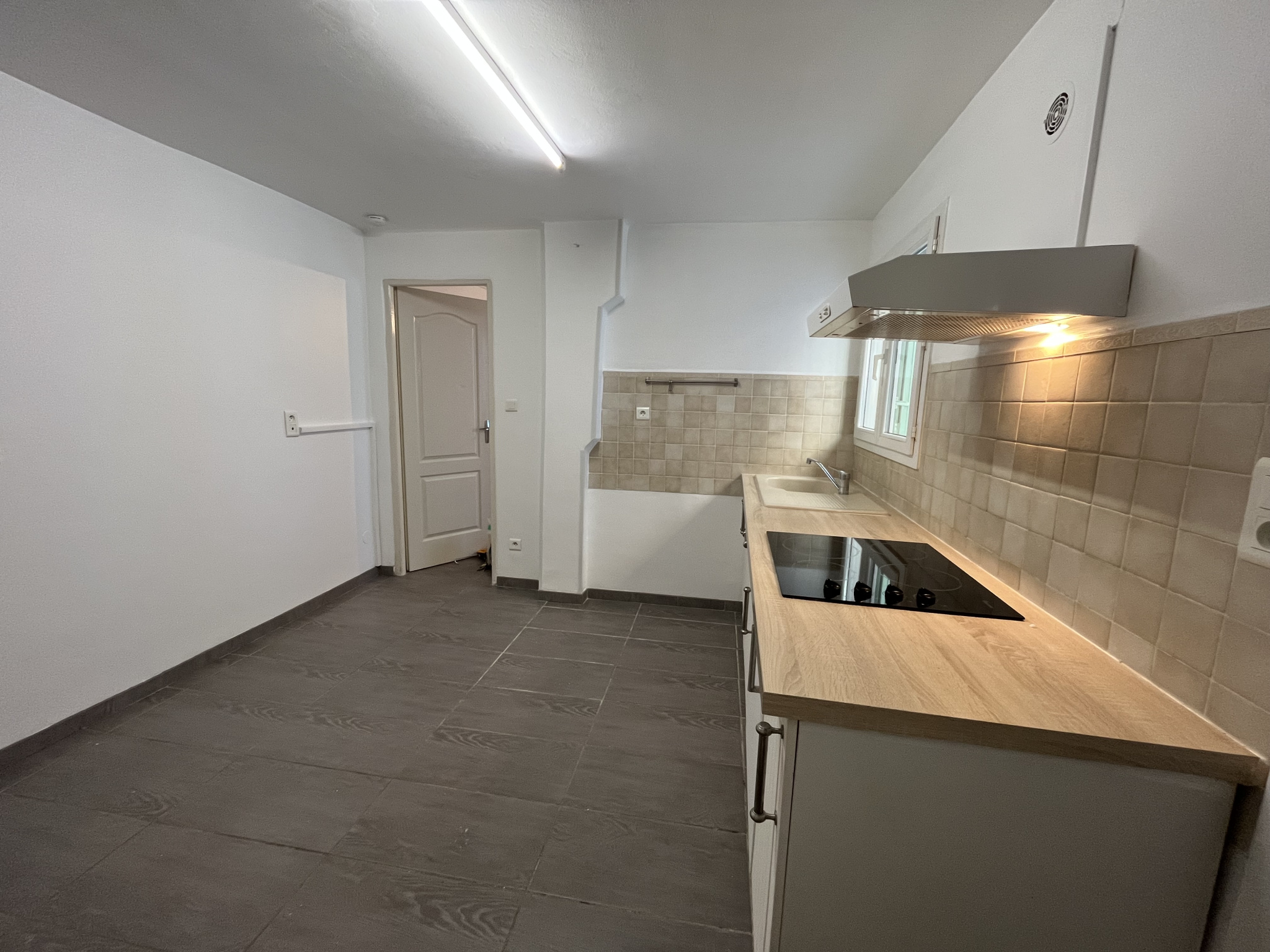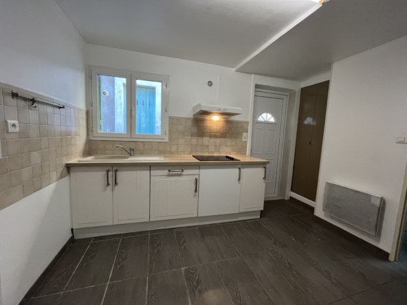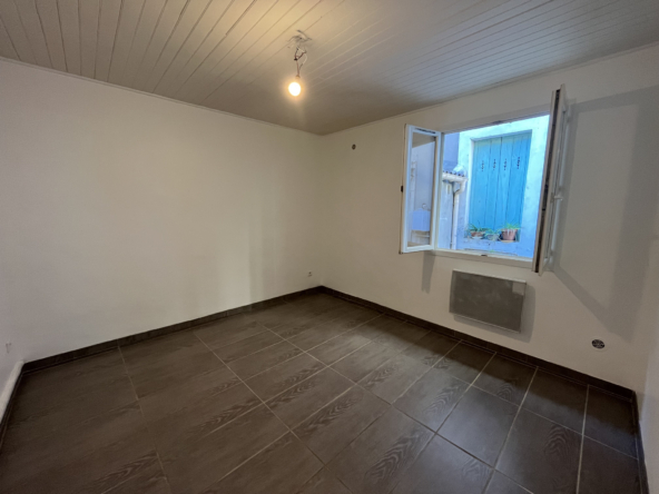 Le bien est situé dans la cour d’un petit immeuble de 5 lots en rdc, personne au dessus. Il est composé d’un salon/cuisine aménagée et semi-équipée (plaque, évier et hotte), une chambre et une salle d’eau avec wc.