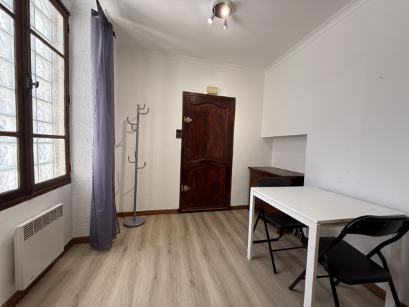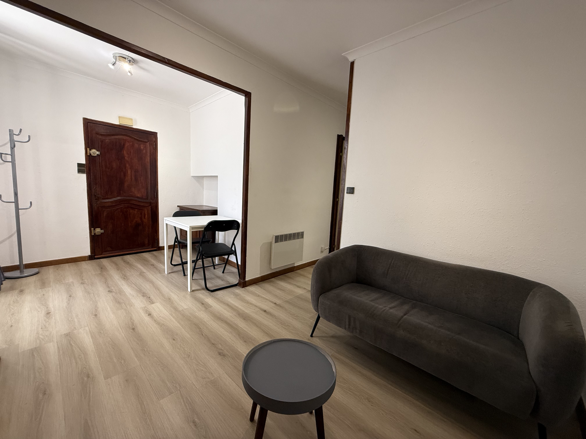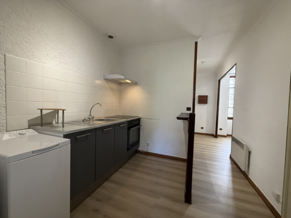 L’appartement situé au 1er étage sur 2 se compose d’un salon, d’une cuisine fermée, aménagée et équipée, d’une salle d’eau avec WC et d’une chambre avec placard.