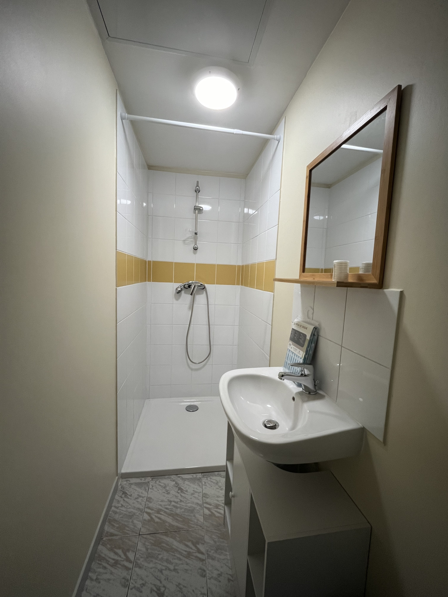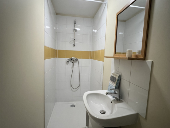 Le bien situé au rdc d’une monopropriété de deux lots comprend un salon, une cuisine aménagée et entièrement équipée (hotte, plaque, évier, réfrigérateur), un toilette séparé, une salle d’eau et une chambre.