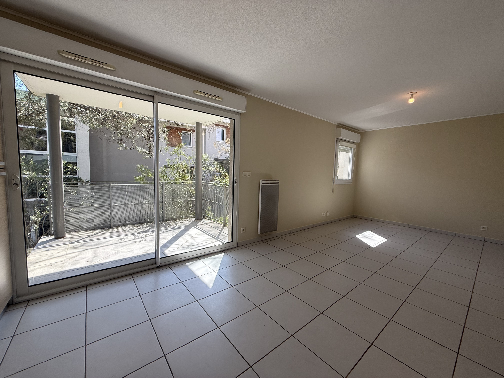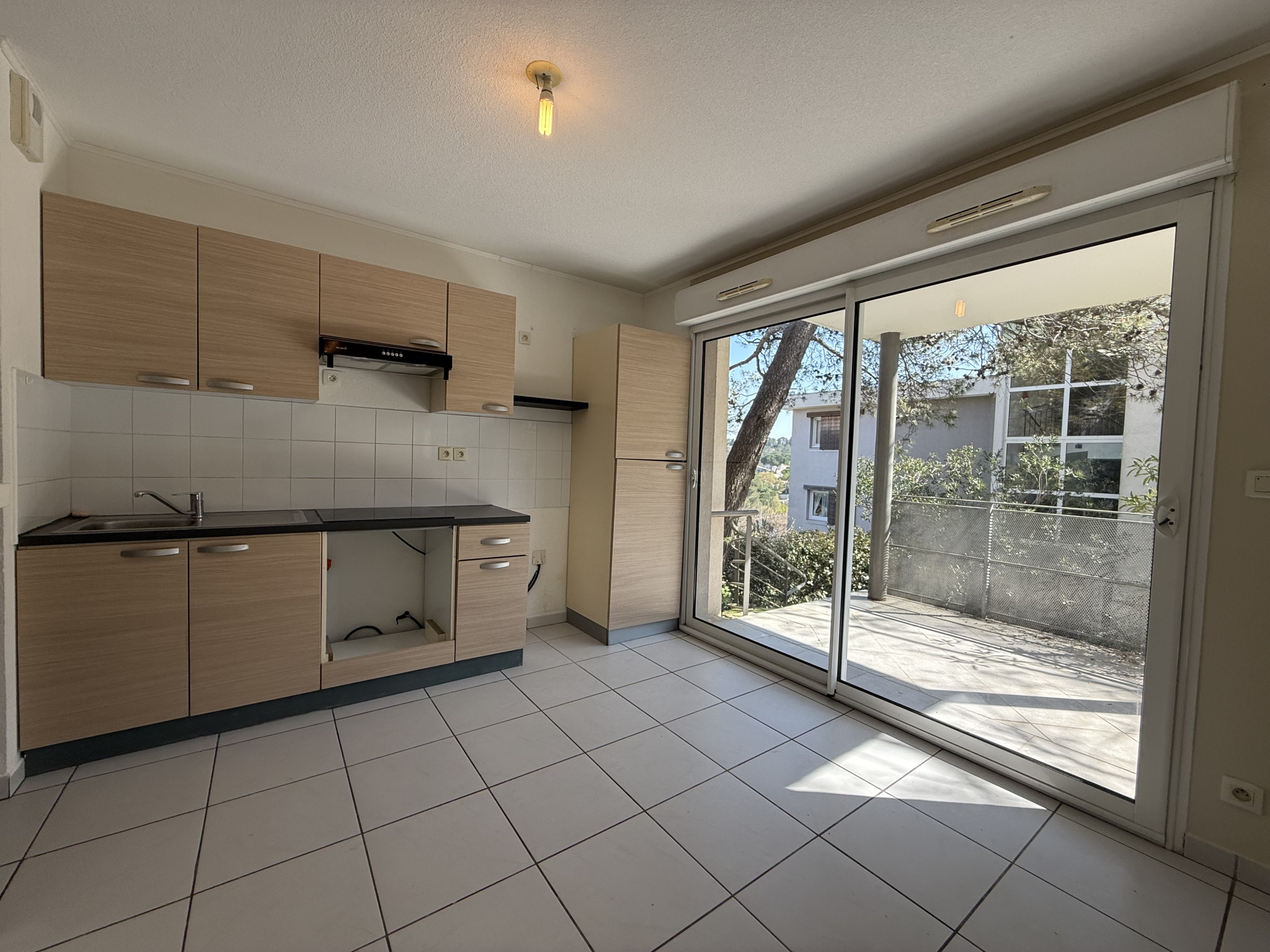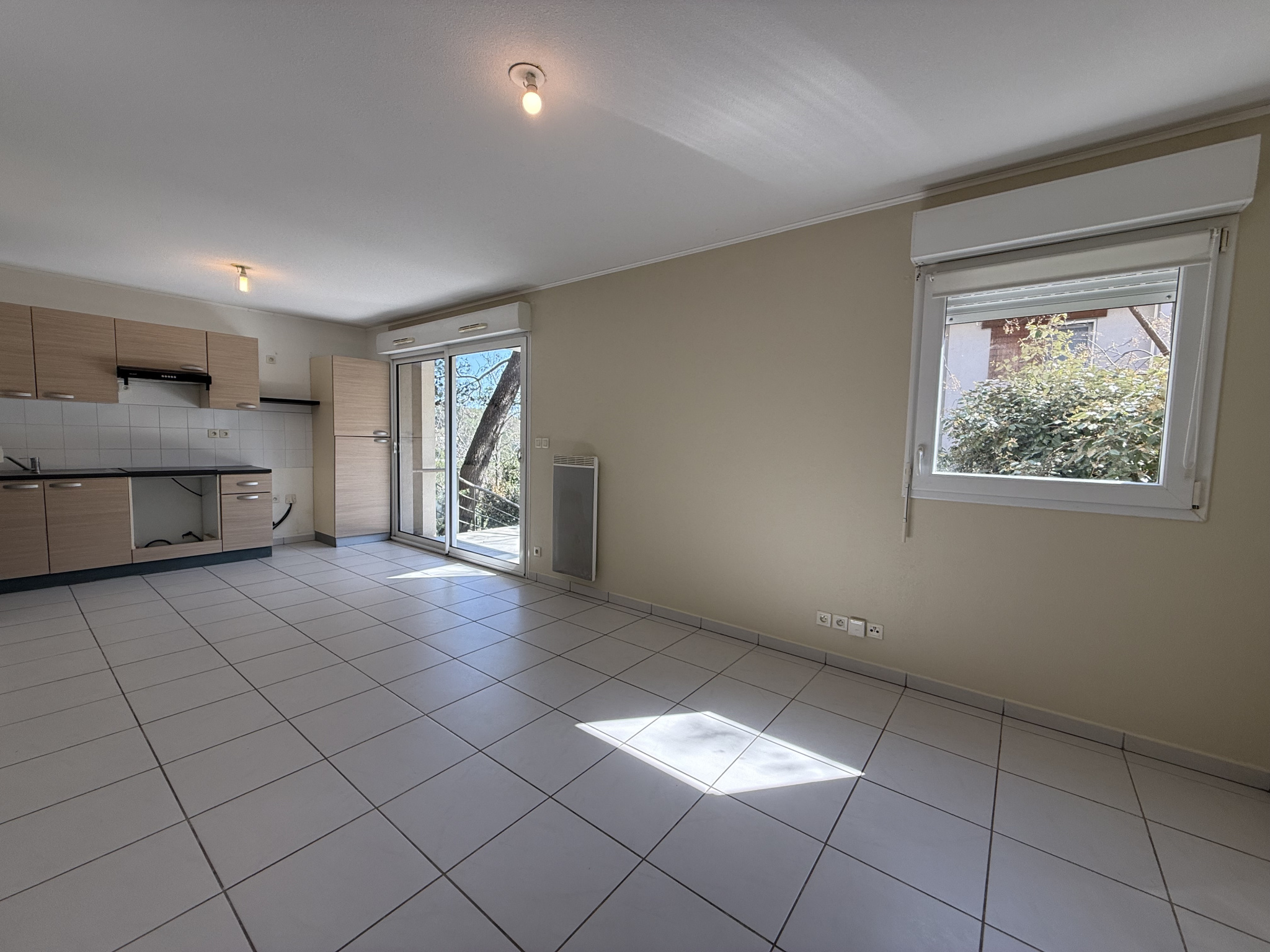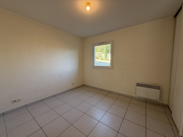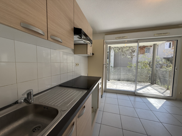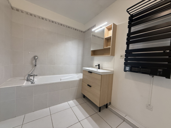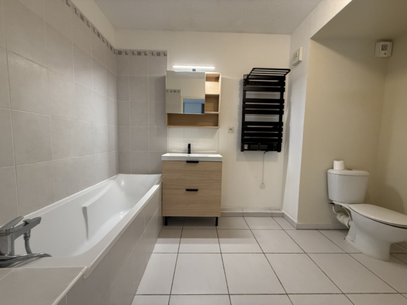 À louer, appartement T2 non meublé en rez-de-jardin. Il se compose d’une entrée avec placard, d’une cuisine aménagée et semi-équipée (évier, plaque électrique, hotte), d’une salle de bains avec baignoire, meuble vasque avec miroir, sèche-serviettes et WC, ainsi que d’une chambre avec placard.