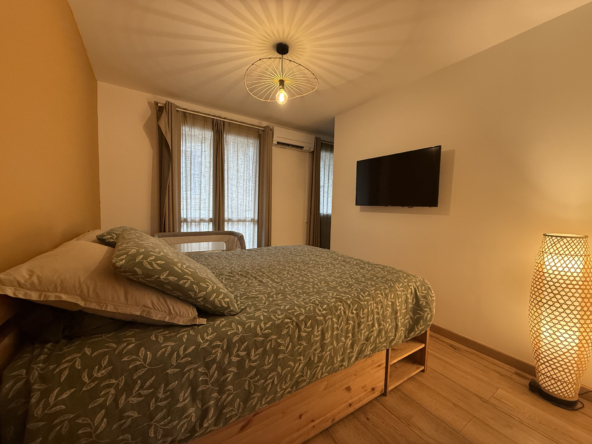 Il se compose d’une entrée, d’une salle d’eau avec WC, ainsi que d’un salon/séjour climatisé ouvrant sur un balcon de 14 m2. La cuisine ouverte, aménagée et reste entièrement équipée, donne accès à un cellier/buanderie. Un couloir avec placard dessert deux chambres équipées chacunes de climatisations réversibles, ainsi qu’une suite parentale comprenant équipée également d’une climatisation un dressing et une salle de bain avec douche et baignoire.