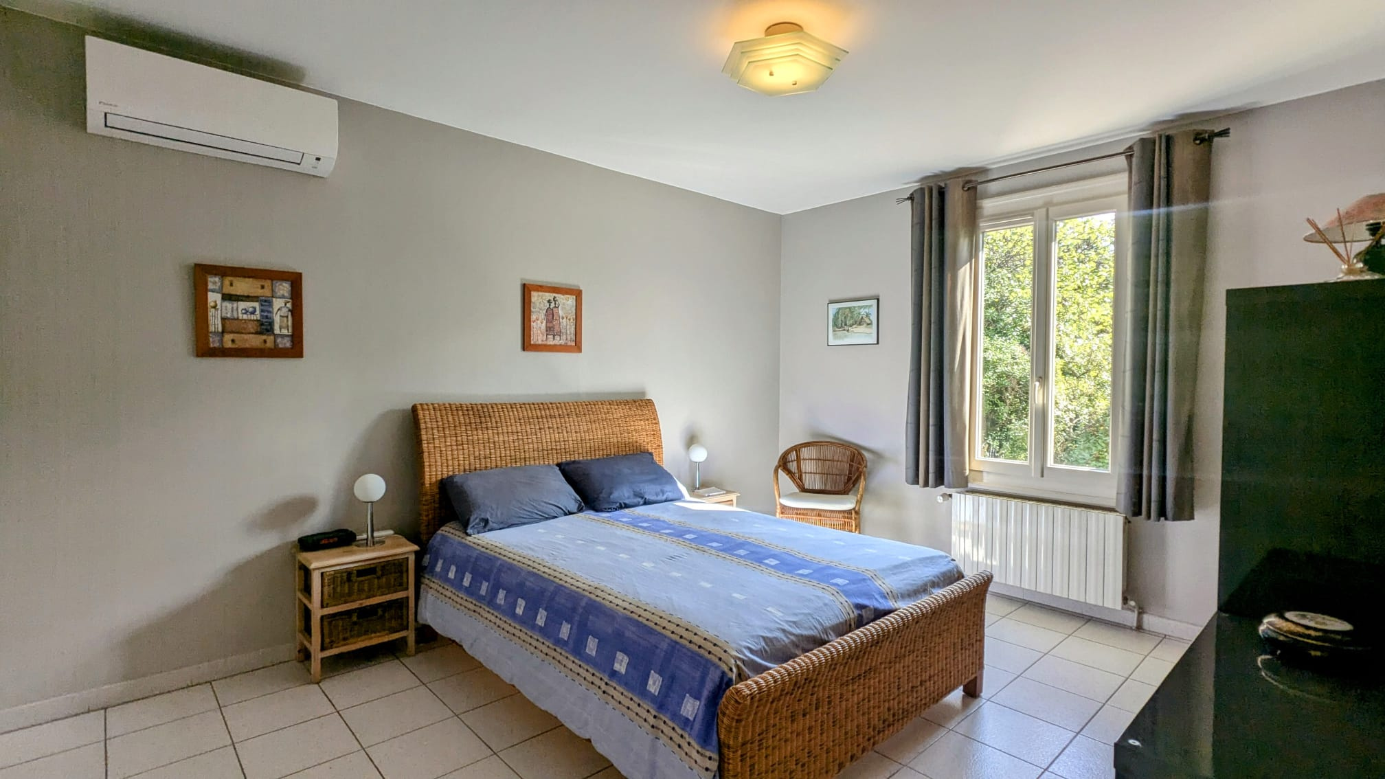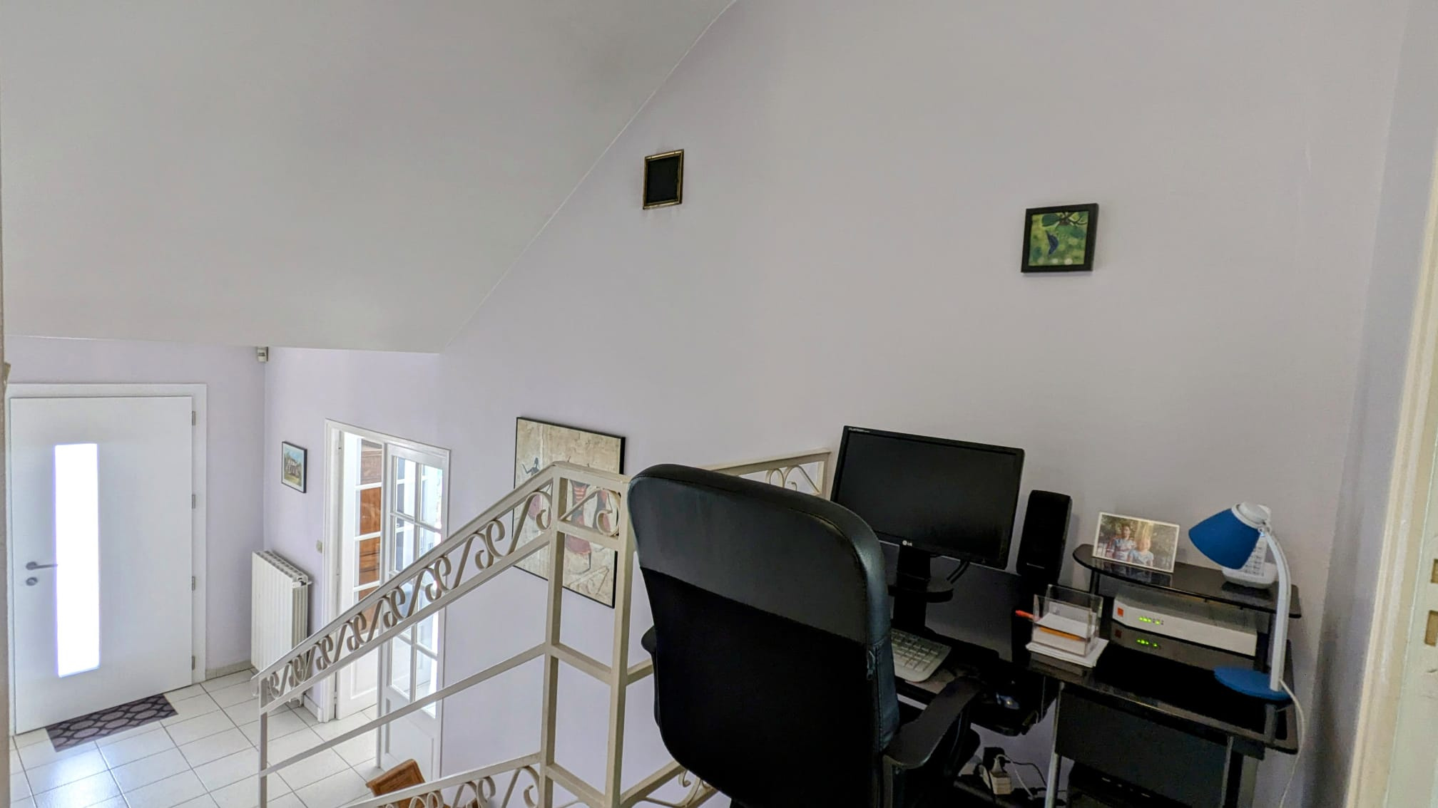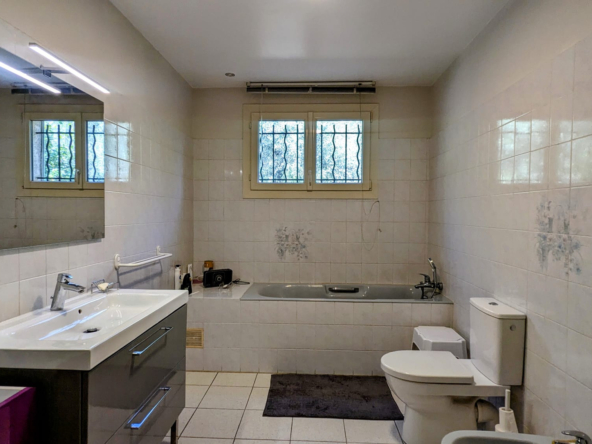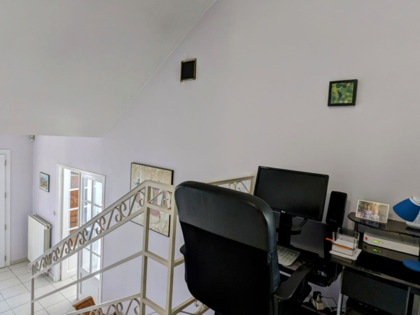 En demi niveau (8 marches) on retrouve l’espace nuit qui se compose de trois chambres, dont une suite parentale avec salle d’eau ainsi qu’une grande salle de bains avec baignoire.