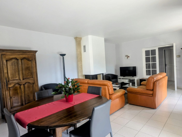 En entrant, vous découvrirez un agencement pratique et confortable : Une spacieuse entrée dessert à gauche une belle pièce de vie lumineuse avec insert au bois et à droite, une cuisine séparée entièrement équipée. On accède également à une buanderie, un WC avec lave-mains et un atelier.