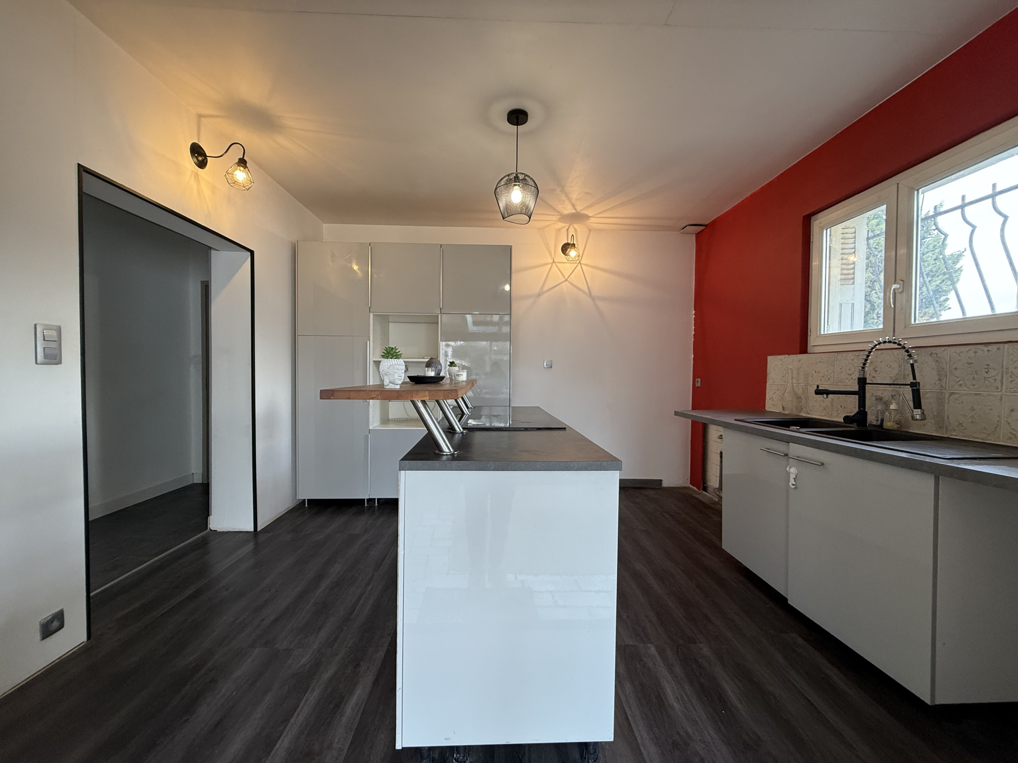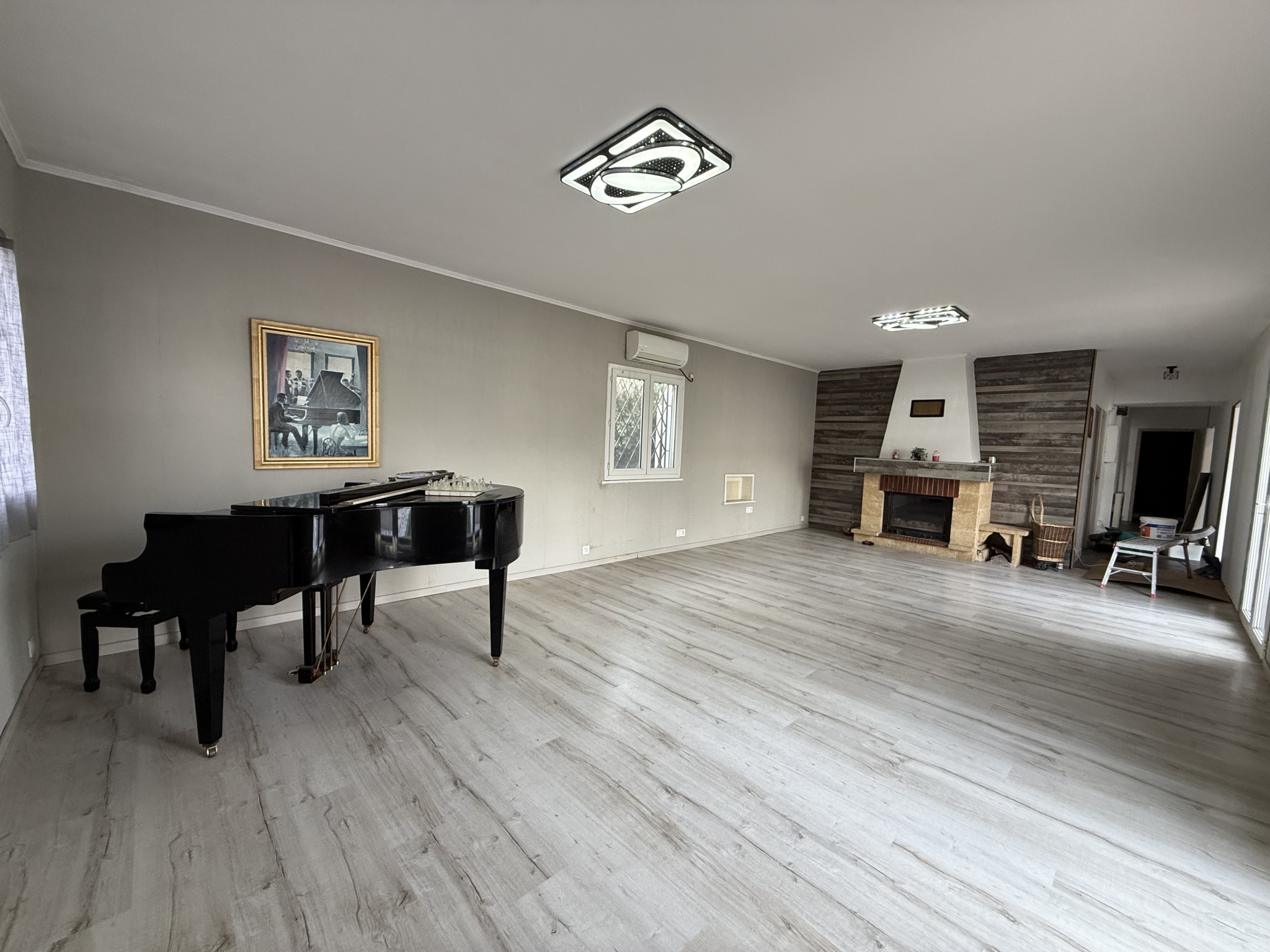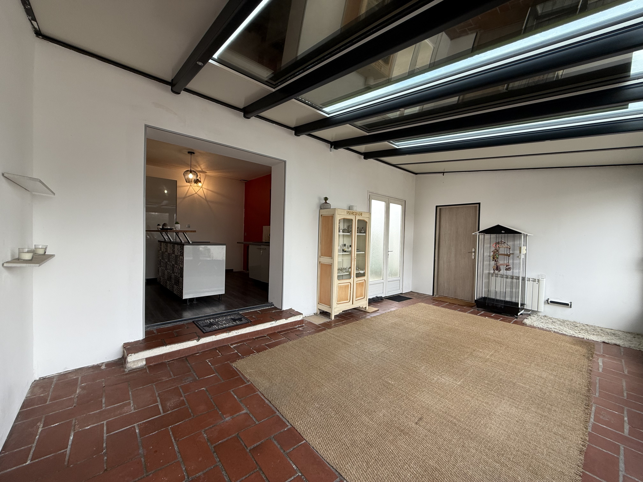 Une véranda (toujours sous garantie décennale) ouverte sur une cuisine aménagée. Une chambre actuellement utilisée comme bureau/salle de sport entièrement refaite. Un salon/salle à manger avec insert fonctionnel et climatisation réversible. Un couloir desservant une salle de bains avec fenêtre refaite, un dressing, un WC séparé avec fenestron et trois chambres.