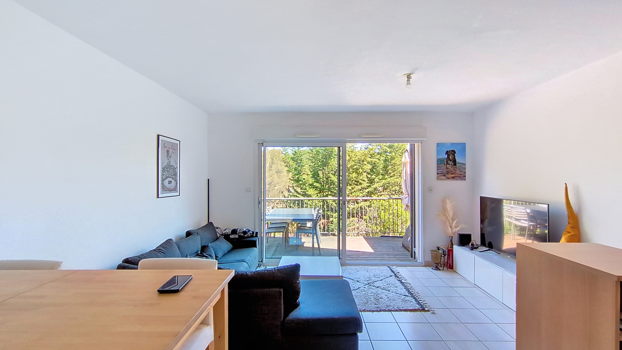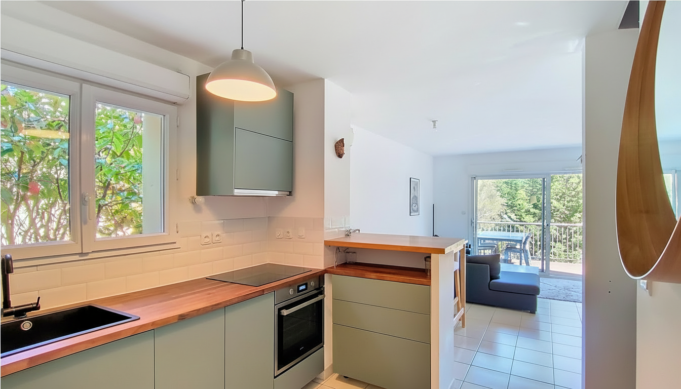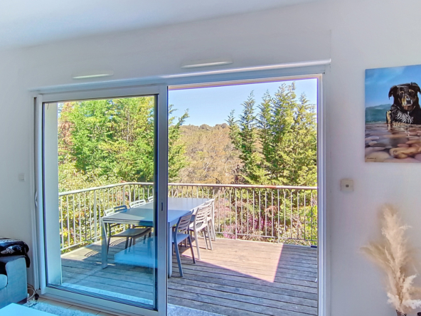 Elle se compose d’un séjour lumineux avec espace salle à manger ouvrant sur une terrasse suspendue offrant une vue dégagée, d’une cuisine ouverte moderne et fonctionnelle, ainsi que d’une buanderie/sellier très pratique.