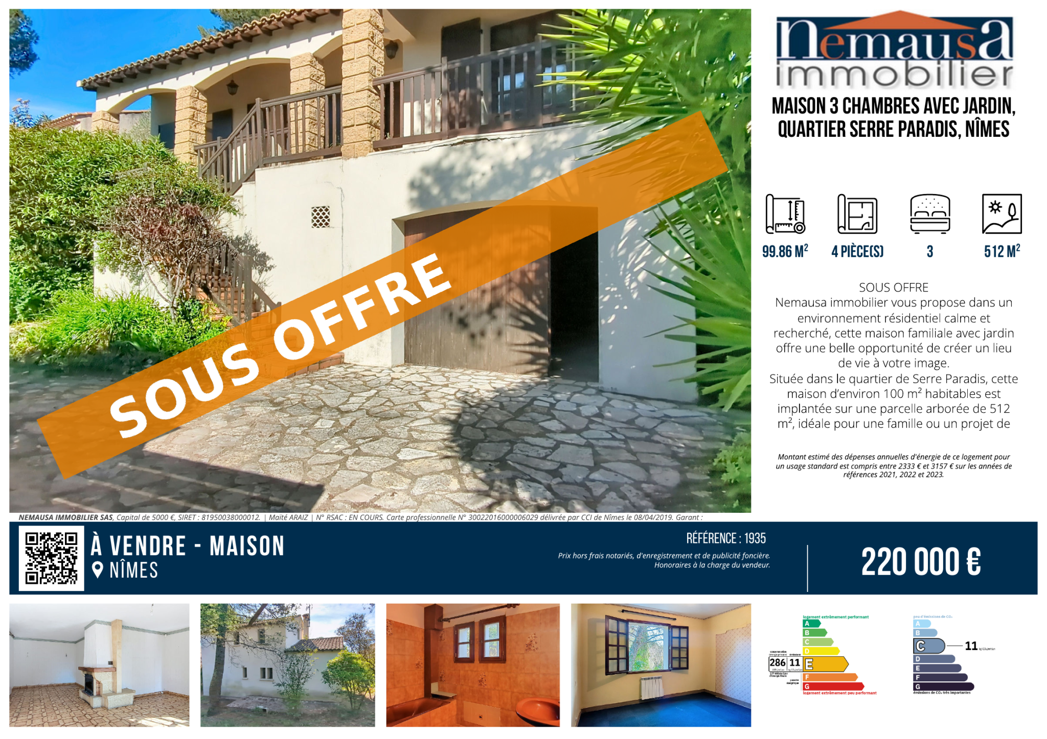 Située dans le quartier de Serre Paradis, cette maison d’environ 100 m2 habitables est implantée sur une parcelle arborée de 512 m2, idéale pour une famille ou un projet de rénovation personnalisé.
