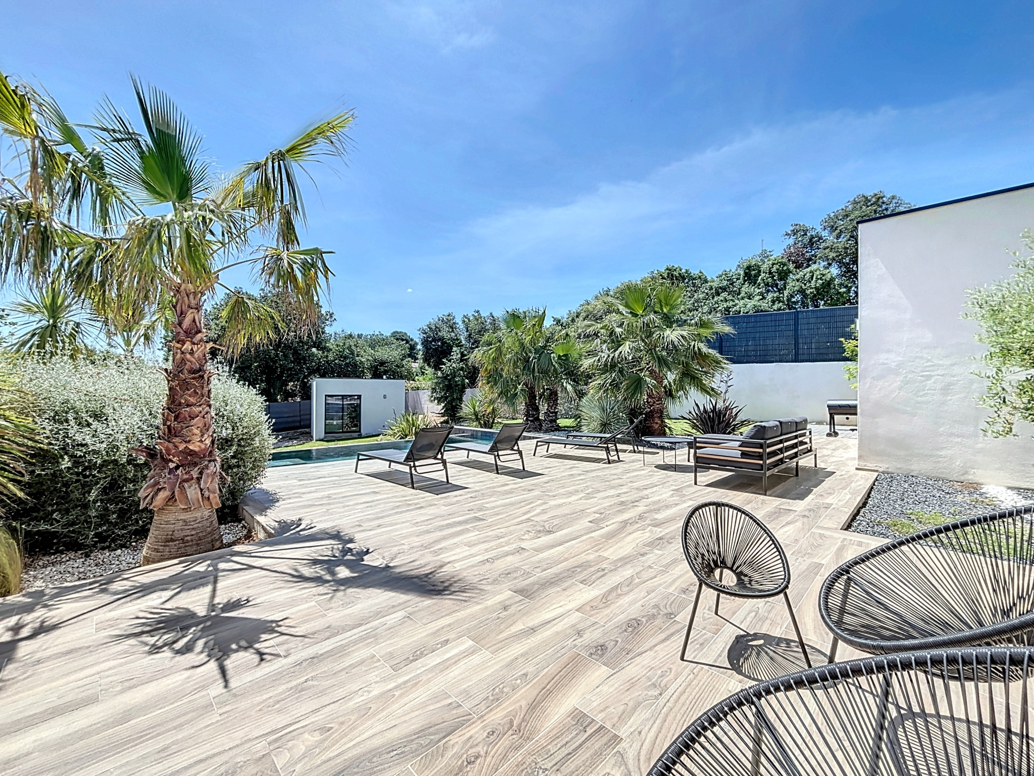Un accès direct à une vaste terrasse exposée plein sud et desservant l’espace piscine.