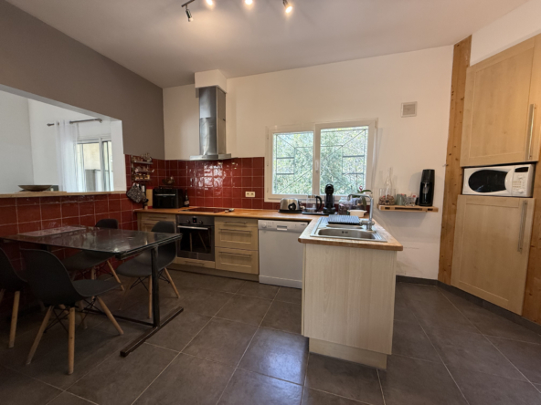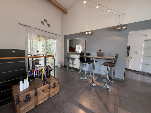 L’entrée s’ouvre sur un hall avec placard. Le séjour traversant, triple exposition, offre un plafond cathédrale et un accès direct à deux terrasses couvertes, parfaites pour profiter des beaux jours. La cuisine semi-ouverte, aménagée et équipée, complète cet espace convivial et chaleureux.