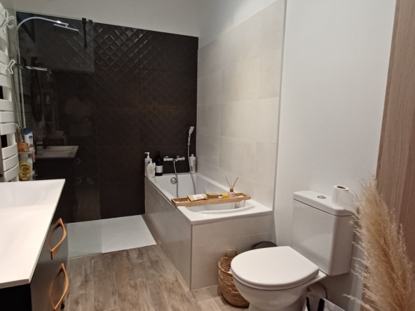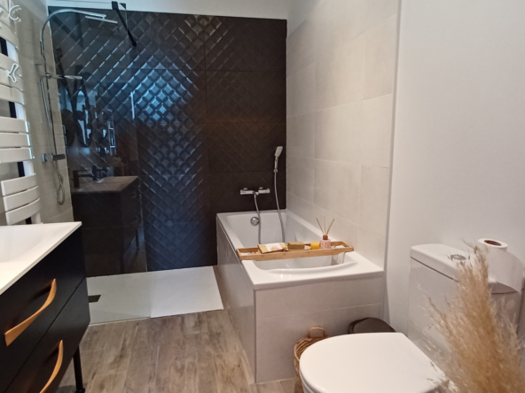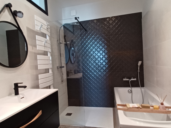 À l’étage de chambre de 12m2 avec rangement, la salle de bain avec douche, WC et double vasque, toujours très bien rénové et plein de charme.