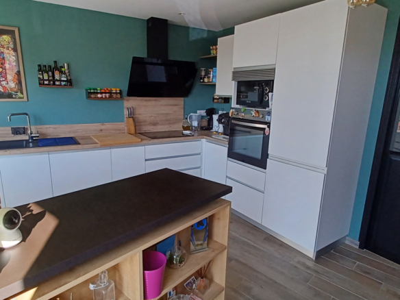 Cette maison en R+1 se compose à l’entrée d’une cuisine toute équipée et moderne, un cellier qui renferme un WC, le salon avec un rangement et l’accès à la terrasse.