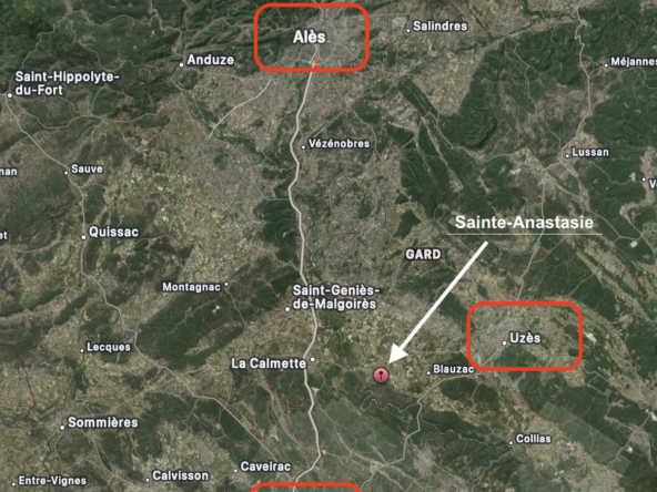 Les biens sont situés sur la commune de Sainte-Anastasie, à seulement 15 minutes de Nîmes et d’Uzès.