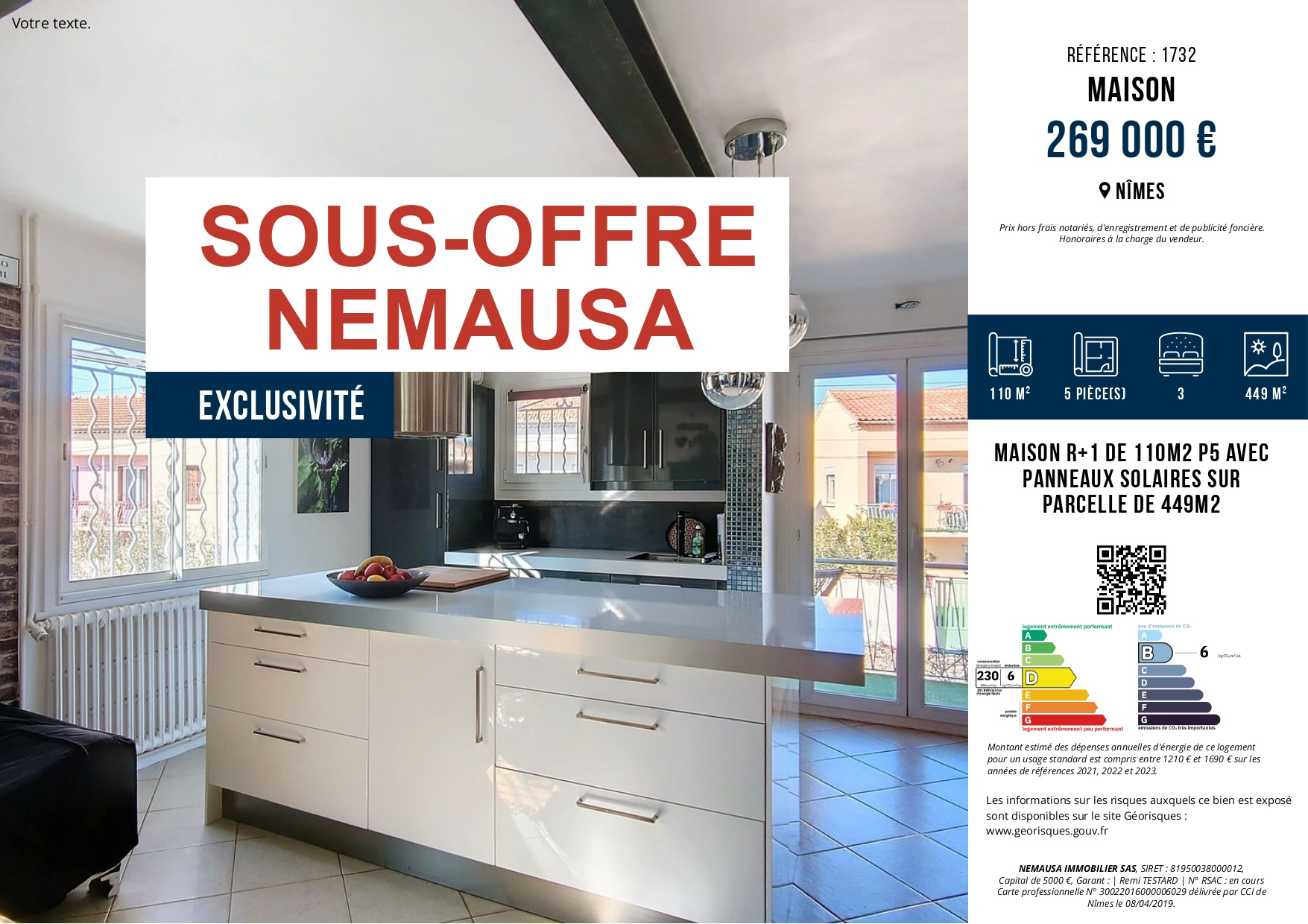 Nemausa Immobilier, 3 agences spécialisées sur Nîmes et sa région, Transactions, Locations, Gestion Locative, maisons, appartements, terrains, locaux commerciaux & fonds de commerce. Siret 819500380, CPI 30022016000006029, enregistrée au RCS de Nîmes. Les informations sur les risques auxquels ce bien est exposé sont disponibles sur le site Géorisques : www. georisques.gouv.fr.